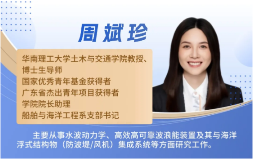 周斌珍,华南理工大学土木与交通学院教授、博士生导师,国家优秀青年基金、广东省杰出青年基金获得者。学院院长助理、船舶与海洋工程系支部书记。主要从事水波动力学、高效高可靠波浪能装置及其与海洋浮式结构物(防波堤/风机)集成系统等方面研究工作。