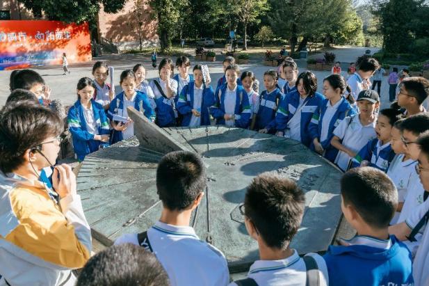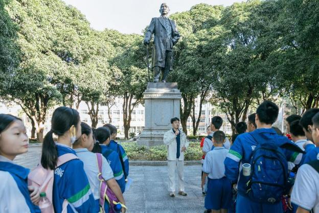 上午8时,华师附中的师生们在追寻讲解队成员的带领下依次参观了我校中山像、泳池铭、百步梯、日晷、校训石等校园历史景观,感受华园美丽的自然环境和浓厚的学术氛围。中山像前的悠久历史、泳池铭中的民族记忆、百步梯下的校园故事都给同学们留下了深刻的印象。