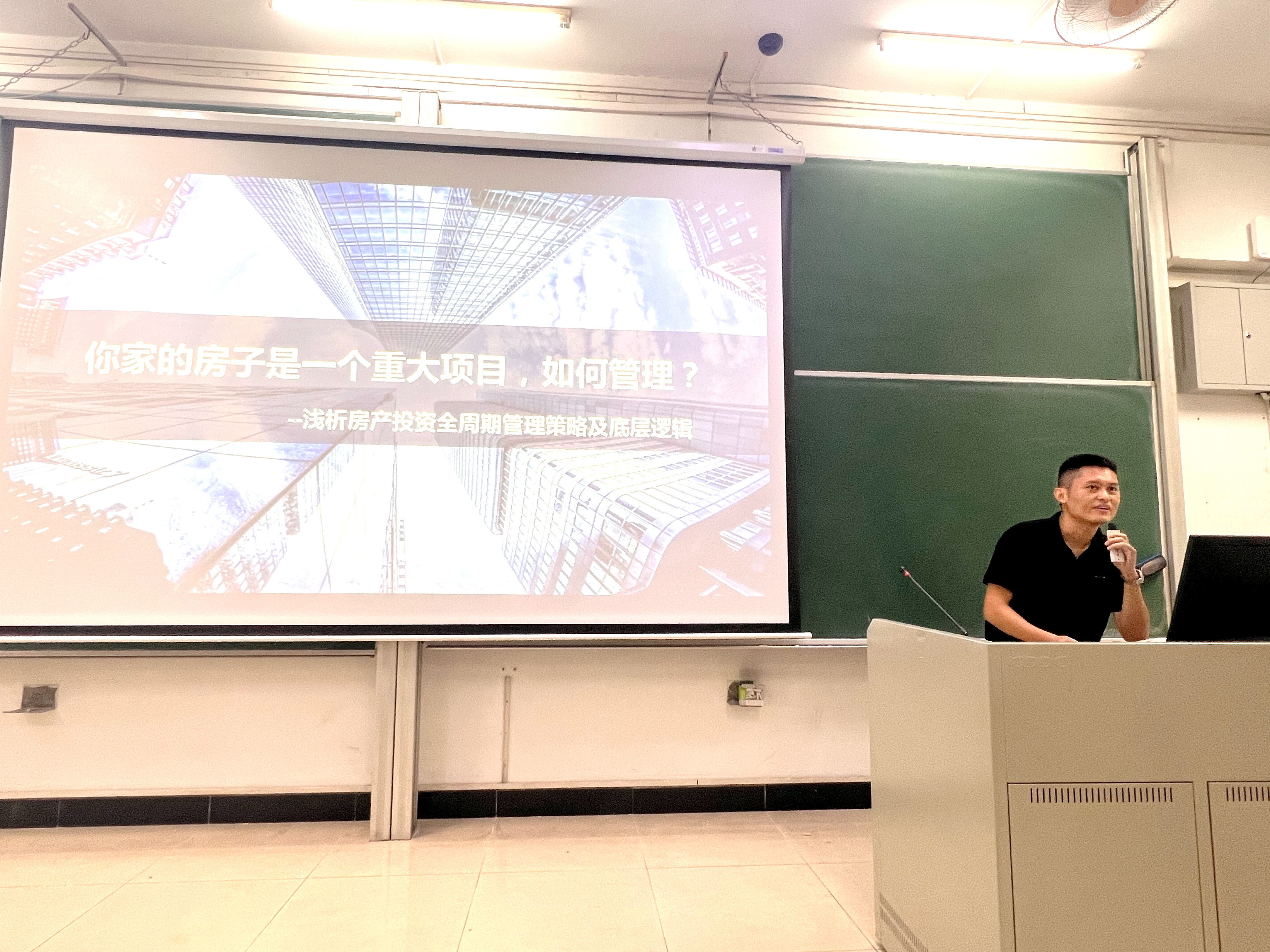 讲座中,张建昂以“房产即重大项目”为核心视角,结合自身丰富实操经验,为师生系统拆解房地产投资全周期管理逻辑。从“投前决策(要不要买、什么时候买、买什么)”“投中执行(风险控制、资产配置)”到“投后优化(价值提升、动态调整)”,他深入浅出地讲解房地产周期规律、投资精算方法、核心策略及市场趋势,尤其针对广州房地产发展现状与未来展望展开重点分析——既解读宏观政策对区域楼市的影响,也分享微观层面“板块选择、户型研判、金融工具运用”等实操技巧,内容兼具专业性与实用性。