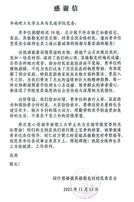 11月12日,我院党委收到阔什塔格镇其格勒克村村民委员会发来的感谢信,确认所有衣物已如数收到。信中表示,这批衣物“犹如一场及时雨”,不仅缓解了部分困难家庭的实际需求,更在入冬之际带来了温暖。其格勒克村党支部、村委会及全体村民向学院党委及全体师生致以诚挚感谢,并表达了将这份关爱转化为振兴乡村动力的决心。这份远方的回音,为本次“衣旧有真情,温暖新疆行”活动画上了温暖而圆满的句号。