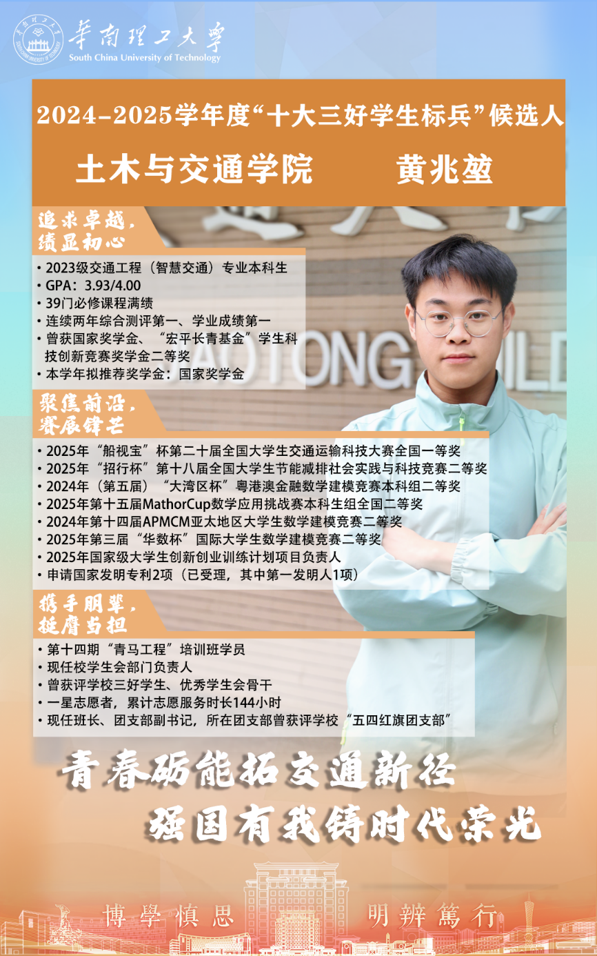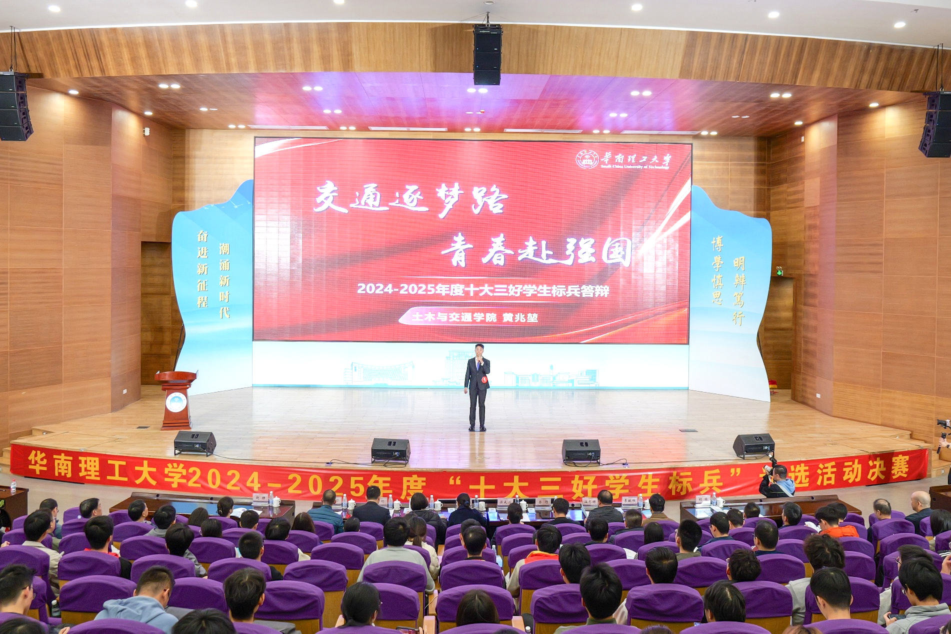 2025年11月21日晚,华南理工大学2024-2025学年度“十大三好学生标兵”决赛在五山校区举行。在决赛中,土木与交通学院2023级交通工程专业黄兆堃同学以优异的现场表现和全面的综合实力,荣获华南理工大学“十大三好学生标兵”荣誉称号!