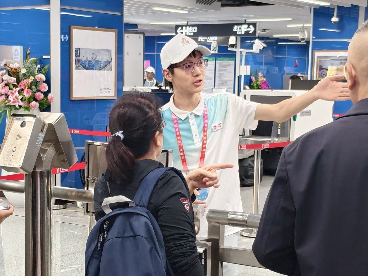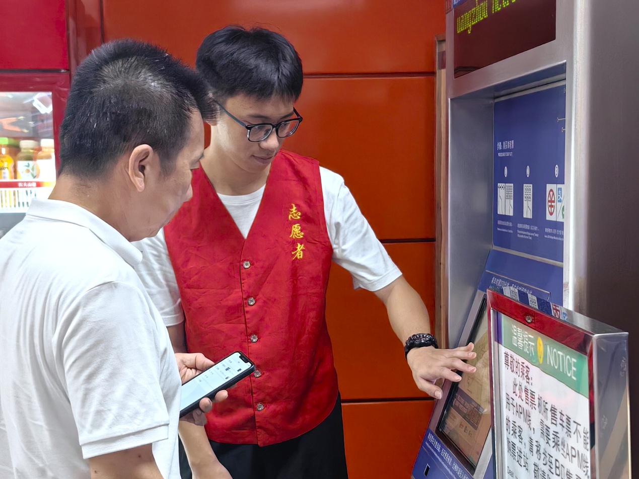 大学城北站作为重要的交通换乘枢纽,承载着通往奥体中心的重要客流。面对日均巨大的客流量,“如何换乘?哪个出口最近?”成为最高频的问题。志愿者李铭新曾遇到一位在站内徘徊的外国友人,他主动上前用英语沟通,耐心在地图上为其指出中转站,最终化解了对方的迷茫。志愿服务远不止于问答。志愿者姜博在早高峰时帮助一位不会用手机买票的观赛老奶奶,反复耐心教其购票;武学剑主动搀扶找不到出站口的老人;陈咏恩在乘客手持物品太多时主动上前帮忙。这些看似简单的举手之劳,却极大地缓解了乘客的旅途劳顿。