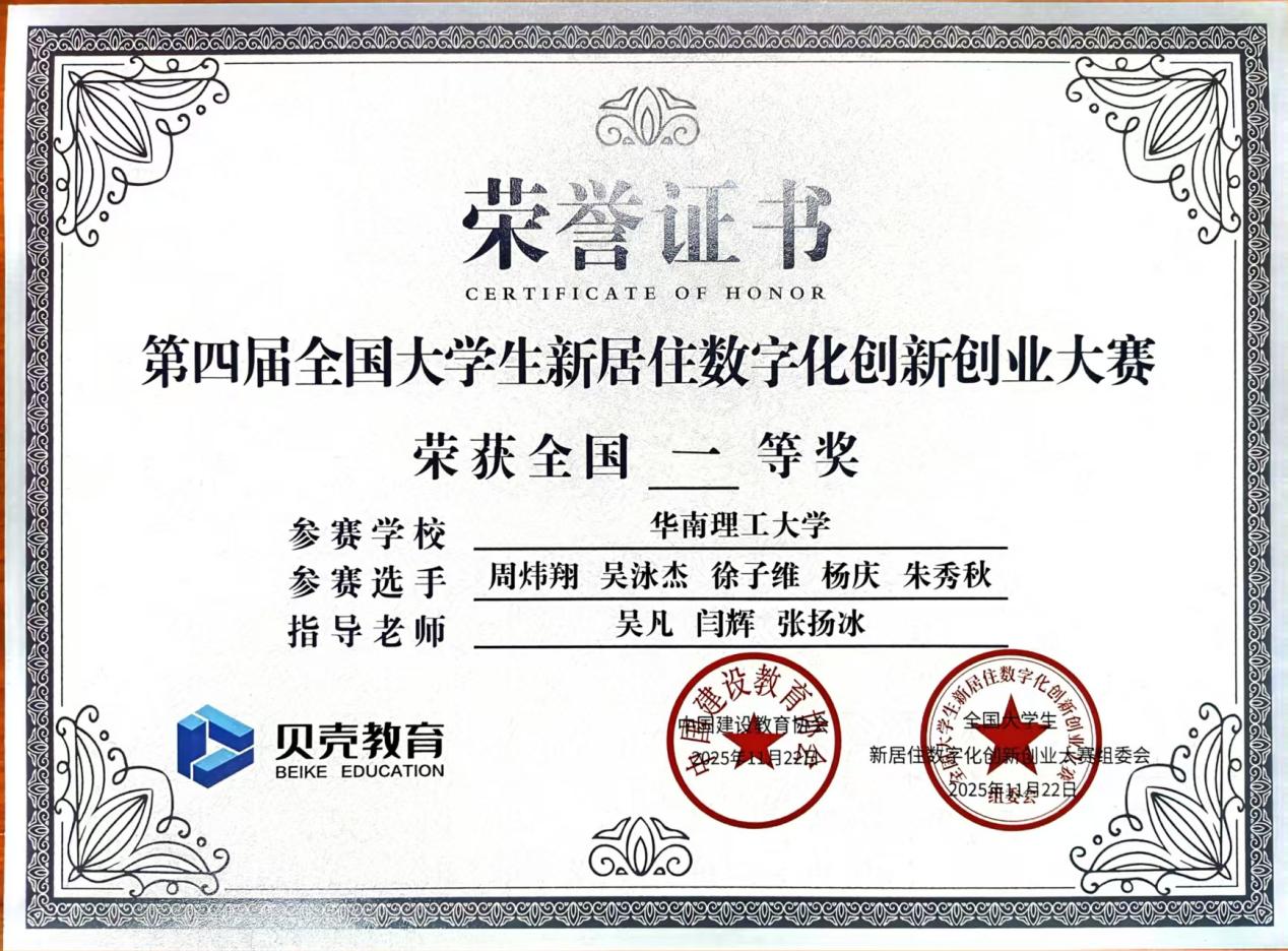 2025年11月22日,“贝壳杯”第四届全国大学生新居住数字化创新创业大赛在重庆大学圆满结束,经过激烈的比拼,代表华南理工大学参赛的“翻斗花园一家人”团队荣获一等奖。