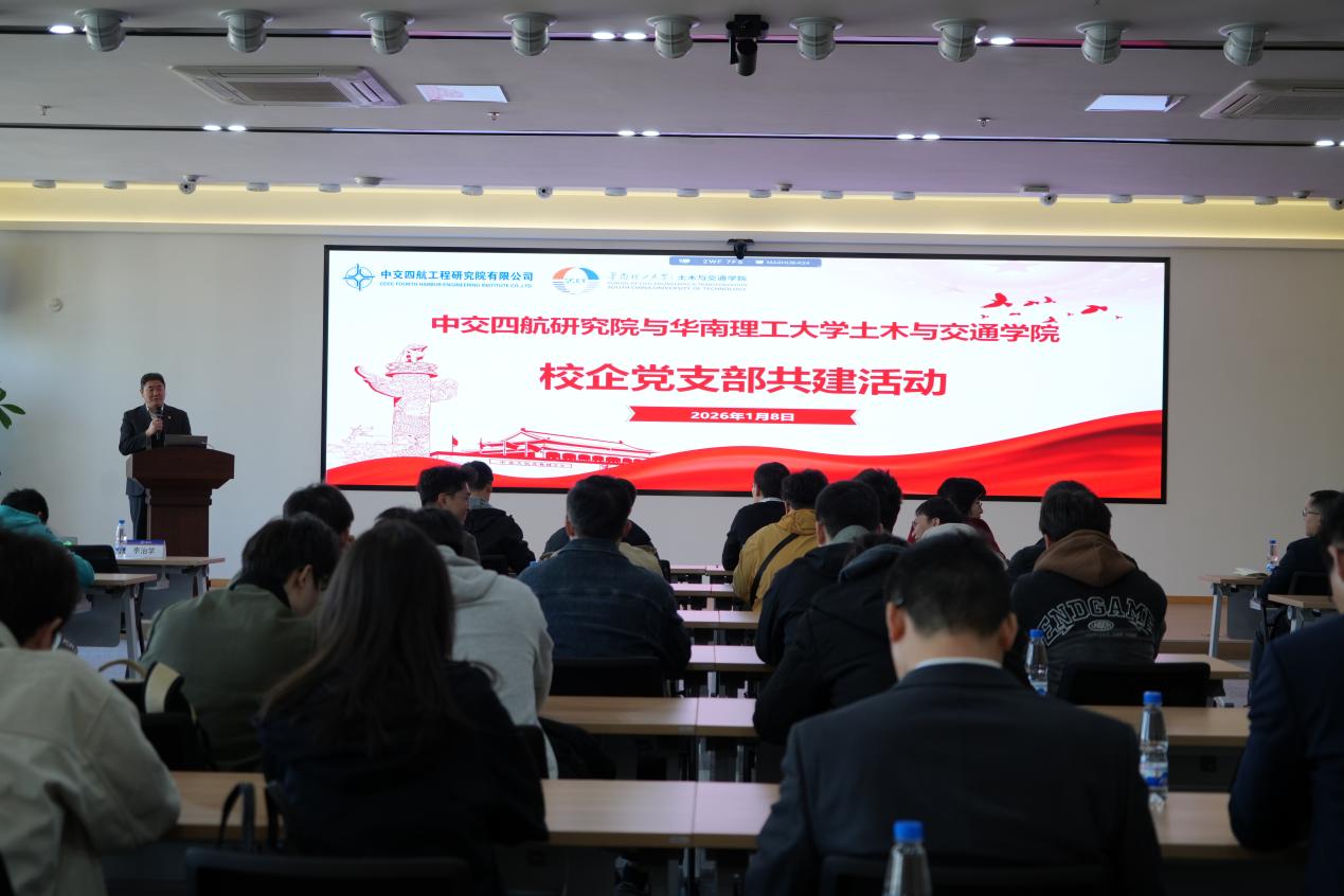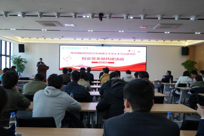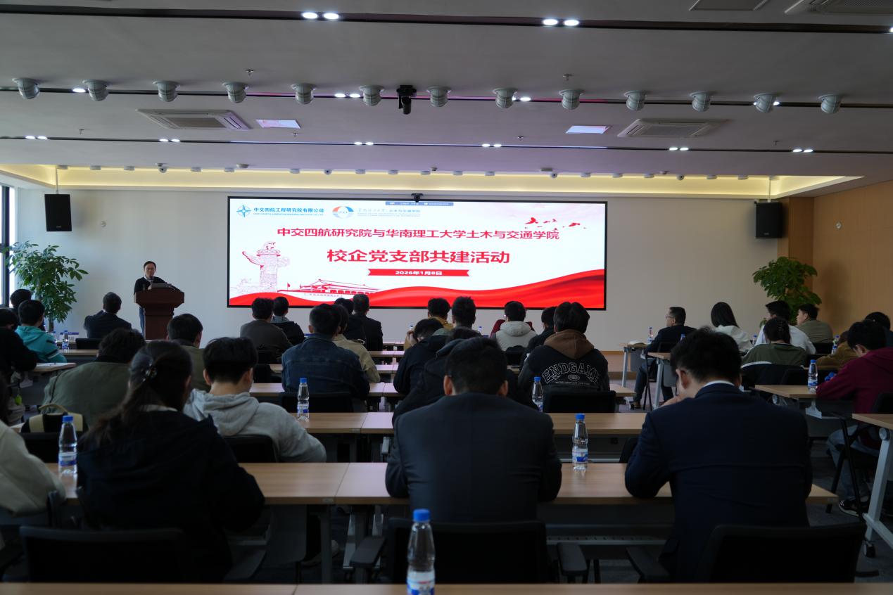 1月8日下午,华南理工大学土木与交通学院、中交四航工程研究院开展了校企党支部结对共建活动。参加活动的有学院党委副书记王磊、相关辅导员、学院研究生土木工程第一党支部和土木工程第二党支部学生党员,中交四航工程研究院党委副书记任德杨、人力资源部经理、党委组织部部长周丽美、研究院结构所党支部书记、所长李治学等企业领导及员工党员共计80余人。