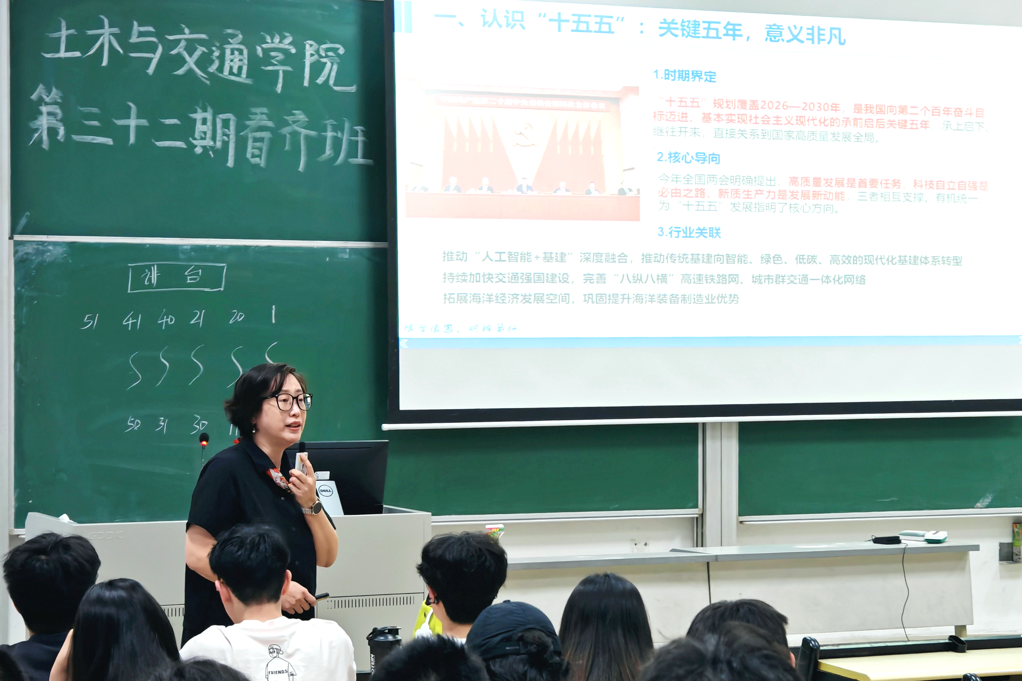 张蔚洁围绕“十五五”规划蓝图、AI时代变革、湾区发展机遇与青年使命担当展开授课。她指出,“十五五”时期是我国向第二个百年奋斗目标迈进的关键阶段,高质量发展、科技自立自强与新质生产力为土木交通行业指明方向。张蔚洁结合广东“十五五”布局,强调粤港澳大湾区建设、基建产业升级及人才政策为相关专业学子提供广阔发展空间,鼓励同学们明确生涯发展路径,涵养优良精气神,将知识转化为实干能力。