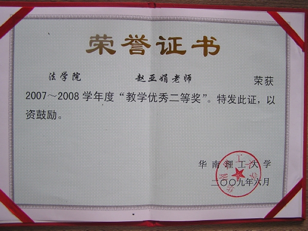 我院赵亚娟老师荣获2007-2008年度“教学优秀二等奖”