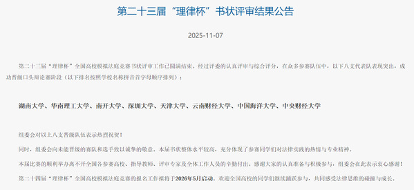 华南理工大学法学院始终秉承“德法兼修”育人理念,坚持以立德树人为根本任务,将“理律杯”作为实践教学核心平台,构建“选拔-指导-实践”闭环培养体系,通过“以赛促学、以赛促练”,推动法学理论与司法实务深度融合。此次参赛不仅是学子专业素养的集中展现,更彰显了学院在卓越法治人才培养中的显著成效。未来,学院将持续深化实践教学改革,为培养兼具创新精神与实践能力的法治人才搭建更广阔平台。(文/谭欣宜)