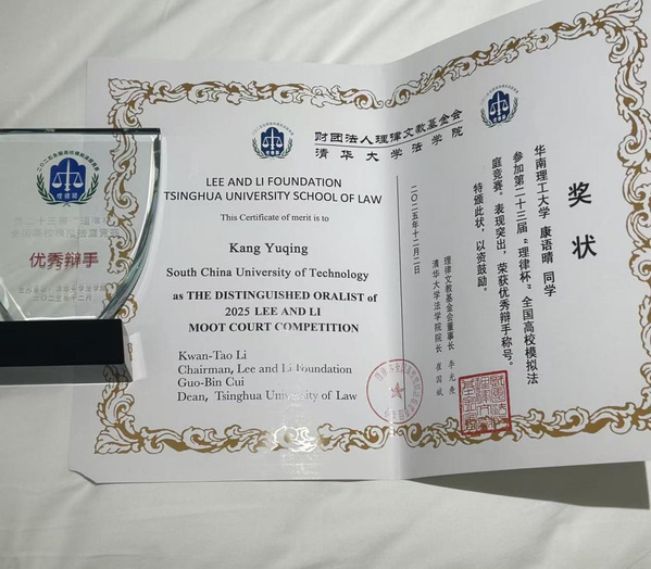 近日,第二十三届“理律杯”全国高校模拟法庭竞赛在清华大学落幕。作为国内顶尖中文模拟法庭赛事,本届竞赛吸引40所高校同台竞技,华南理工大学法学院代表队突围50所高校参与的文书选拔赛,晋级全国8强现场庭辩,2023级本科生康语晴获评 “优秀辩手”,展现了华工法学人才培养的扎实成效。
