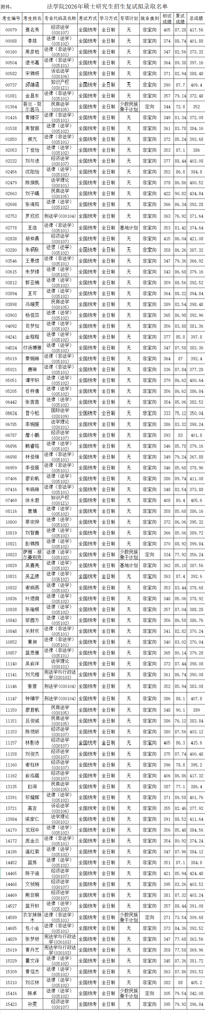 关于公示法学院2026年硕士研究生统考招生复试拟录取名单的通知
