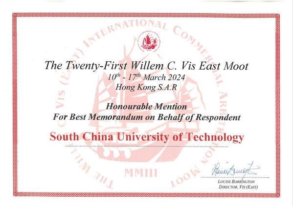 In this year’s competition, the South China Universityof Technology (SCUT) team once again delivered an outstanding performance,standing out among 144 participating teams from 33 countries and regionsworldwide. The SCUT team was awarded an Honourable Mention for Best Memorandumon Behalf of Respondent, a prestigious recognition for excellence in writtenadvocacy. This marks the first time that the SCUT team has achieved abreakthrough in the memorial writing category since it began participating inthe Willem C. Vis (East) International Commercial Arbitration Moot in 2021 and2022.
