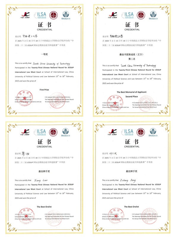 From February15 to 18, 2025, the 23rd Philip C. Jessup International Law Moot CourtCompetition – China National Round was successfully held at the HaidianCampus of China University of Political Science and Law (CUPL). The event washosted by CUPL’s School of International Law and attracted participation fromnumerous top universities across the country. After a series of intense andhigh-level rounds, the South China University of Technology (SCUT) teamdelivered an outstanding performance, finishing 5th overall in total score andwinning a First Prize (National Level). The team was ranked among the Top 8 inChina and successfully advanced to the International Rounds to be held inWashington, D.C., USA—becoming one of only nine teams from Mainland China to qualifyfor the global stage. In addition to the team’s collective achievement, Deng Zicheng and LiaoXiangrong, who appeared in the oral rounds, were awarded Best Oralist honors.The SCUT team also received the award for Best Memorial on Behalf of theApplicant.