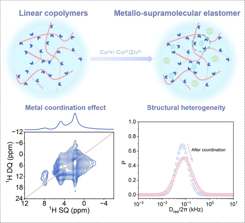 The integration of weak sacrificial bonds into the polymer networks has become a universal approach for enhancing the mechanical properties of polymers. Particularly, the presence of non-covalent associative interactions leads to significant changes in polymer dynamics and viscoelastic behaviors. In this study, we report a high-performance metallo-supramolecular elastomer based on metal-imidazole coordination. Different metal ions, including Cu2+, Co2+, and Zn2+, were incorporated into a random copolymer composed of ethyl acrylate (EA) and 1-vinylimidazole (VI), resulting in dramatic variation in mechanical and viscoelastic properties due to differences in metal-coordination strength. High-resolution 2D 1H double-quantum/single-quantum (DQ/SQ) NMR spectroscopy directly reveals the formation of metal-coordination in the polymer materials and shows that metal-coordination leads to enhanced structural and dynamic heterogeneity. Specifically, both local segmental motions and terminal relaxation of metallo-supramolecular elastomer are slowed down by the metal-coordination. This study provides detailed molecular-level insights into the structure and dynamics of polymer networks with varying metal-coordination strengths, providing great potential for the rational design of high-performance metallo-supramolecular polymers. Link: https://onlinelibrary.wiley.com/doi/10.1002/marc.202500601 |