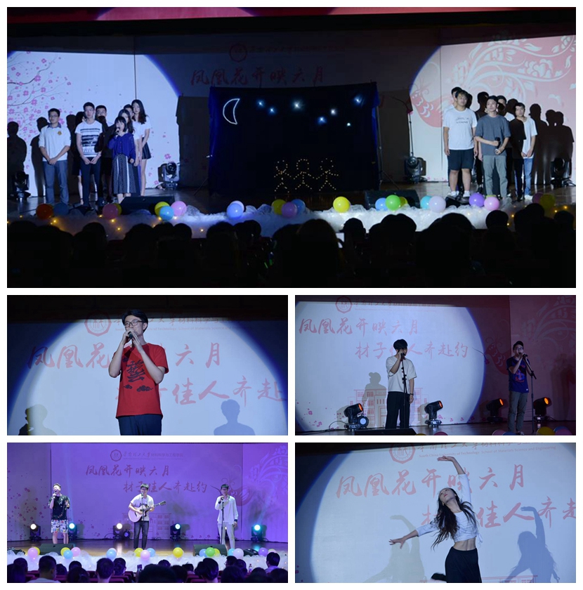 本次毕业晚会内容分为相遇、忆昔、启程三部分。在“相遇·展蓬勃朝气”里,16硕士周泉演唱《沙龙》,告诉我们珍惜相遇的意义;15电材刘嘉滨、15无机许祖华、15材创伍海健以《We are young》歌尽似火青春;15高甲李世明、15高丙刘尚润演奏串烧歌曲《当我们一起蜂过》,鼓励毕业生坚持目标不放弃;16材化周佳宁用曼妙的舞姿演绎《消愁》,向我们缓缓传达着属于这个年纪的绵绵愁绪;15光电班的合唱《夜空中最亮的星》诉说着他们黑暗中的不懈和追寻。