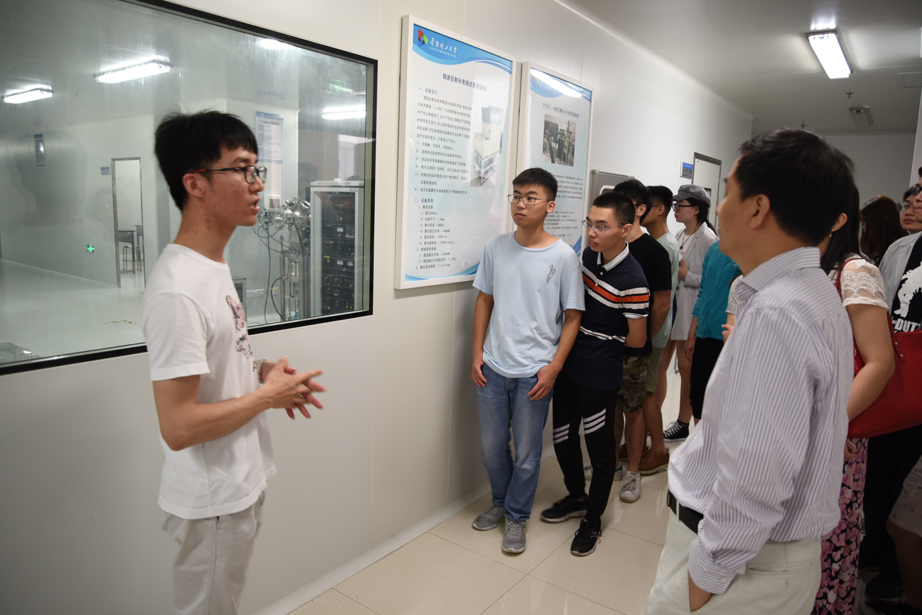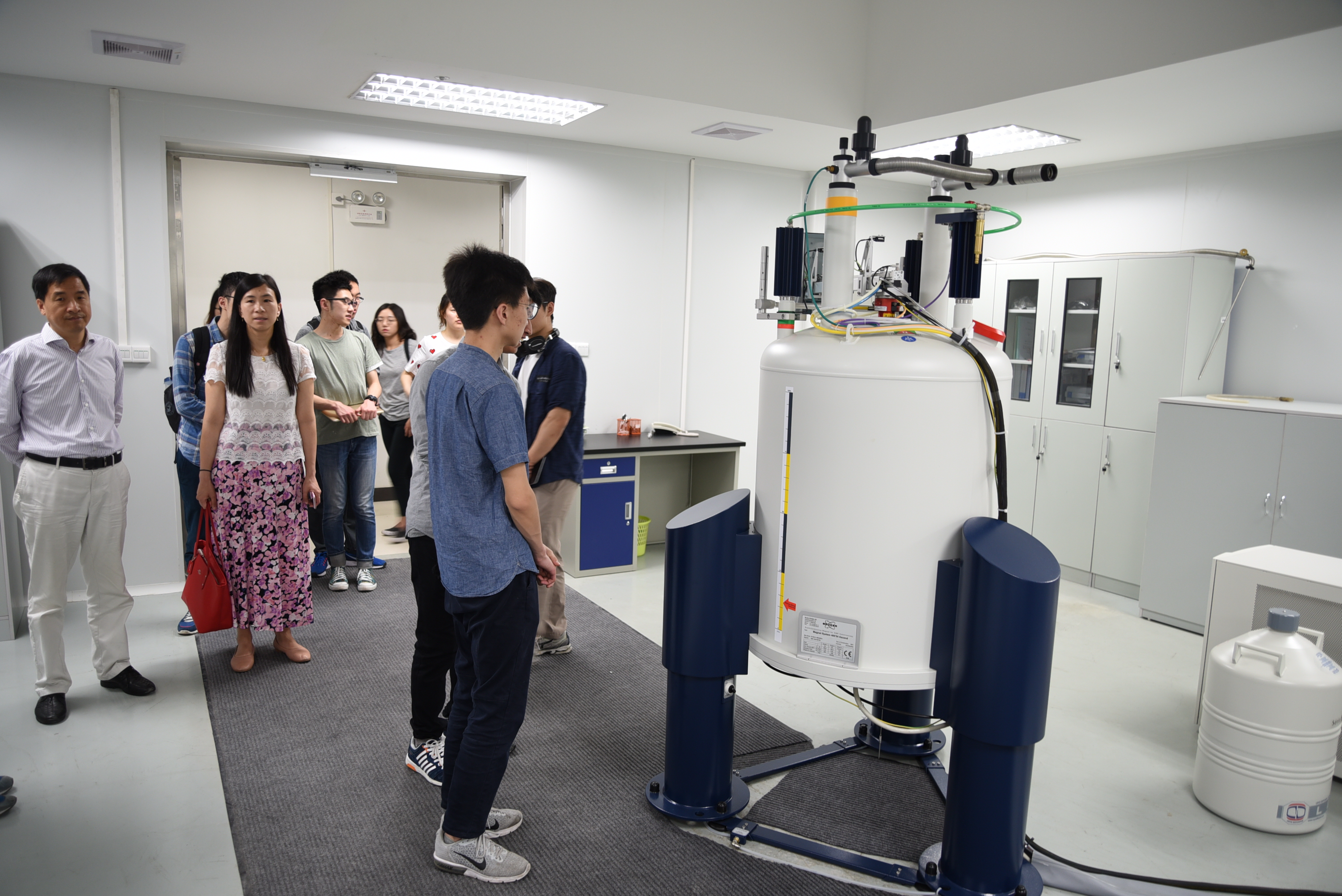 上午九时三十分,复旦高分子系师生乘车抵达了我院发光材料与器件国家重点实验室,与华工高分子系的同学们一同参观。实验室的梁老师首先介绍了国家重点实验室的基本情况,科研方向与科研进展。接着带领同学们参观了国家实验室的超净实验间和大型核磁共震氢谱仪,向大家介绍设备的基本用途。随后,两校师生步成果展示大厅,听取梁老师介绍国家重点实验室近些年的科研成果与在产业上的应用。从透明显示屏到柔性显示屏,再到聚集诱导发光的研究成果,发光器件的魅力令人着迷。