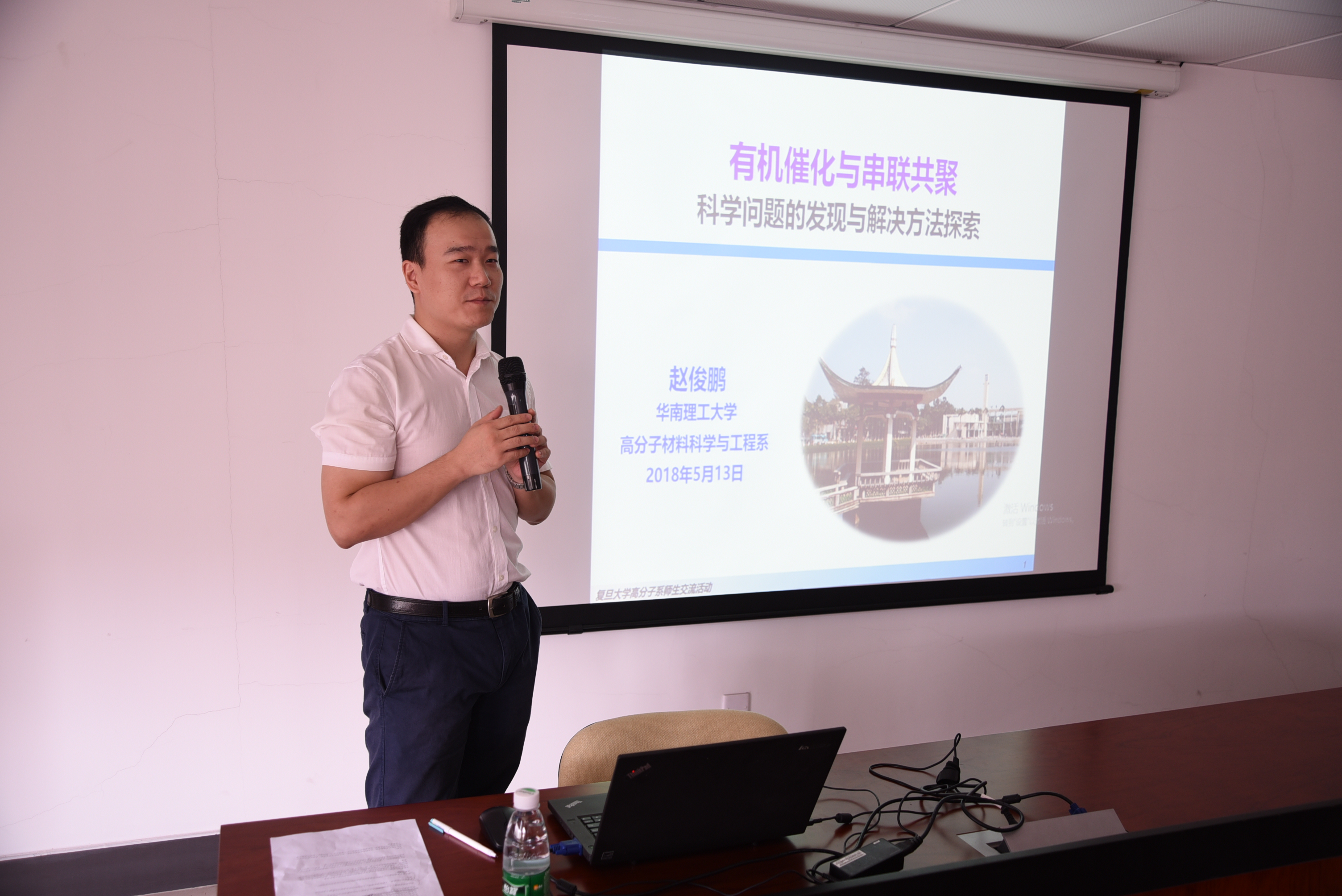 上午十时,两校师生进入会议厅,交叉落座,参加交流会。首先由赵俊鹏老师做了题为“有机催化与串联共聚:科学问题的发现与解决方法探索”的讲座,从自己在国外做科研期间遇到的问题入手,从问题一步步的解答过程,简要的为同学们讲解了科学问题的发现与解决方法。随后,由两校同学向赵老师提出了一些专业上的问题,赵老师一一作出了细致的解答。随后,由两校的学生代表先后上台介绍了自己的科研项目,加深了两校师生对对方学术上的了解。