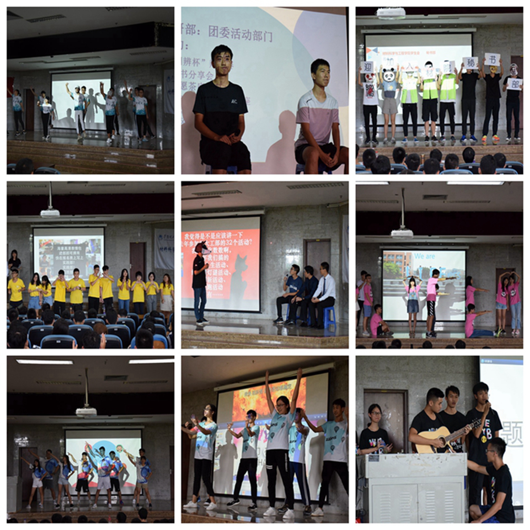 材料学院团委下属五个部门:组织部、实践部、宣传部、课外科研部和素质拓展部,以及学生会下属七个部门:秘书部、生活部、体育部、大学城工作部、记者团、网络部和艺术分团。接下来十二个部门依次上场,为新生们介绍了部门工作和职能,并表演精心准备的展示节目。