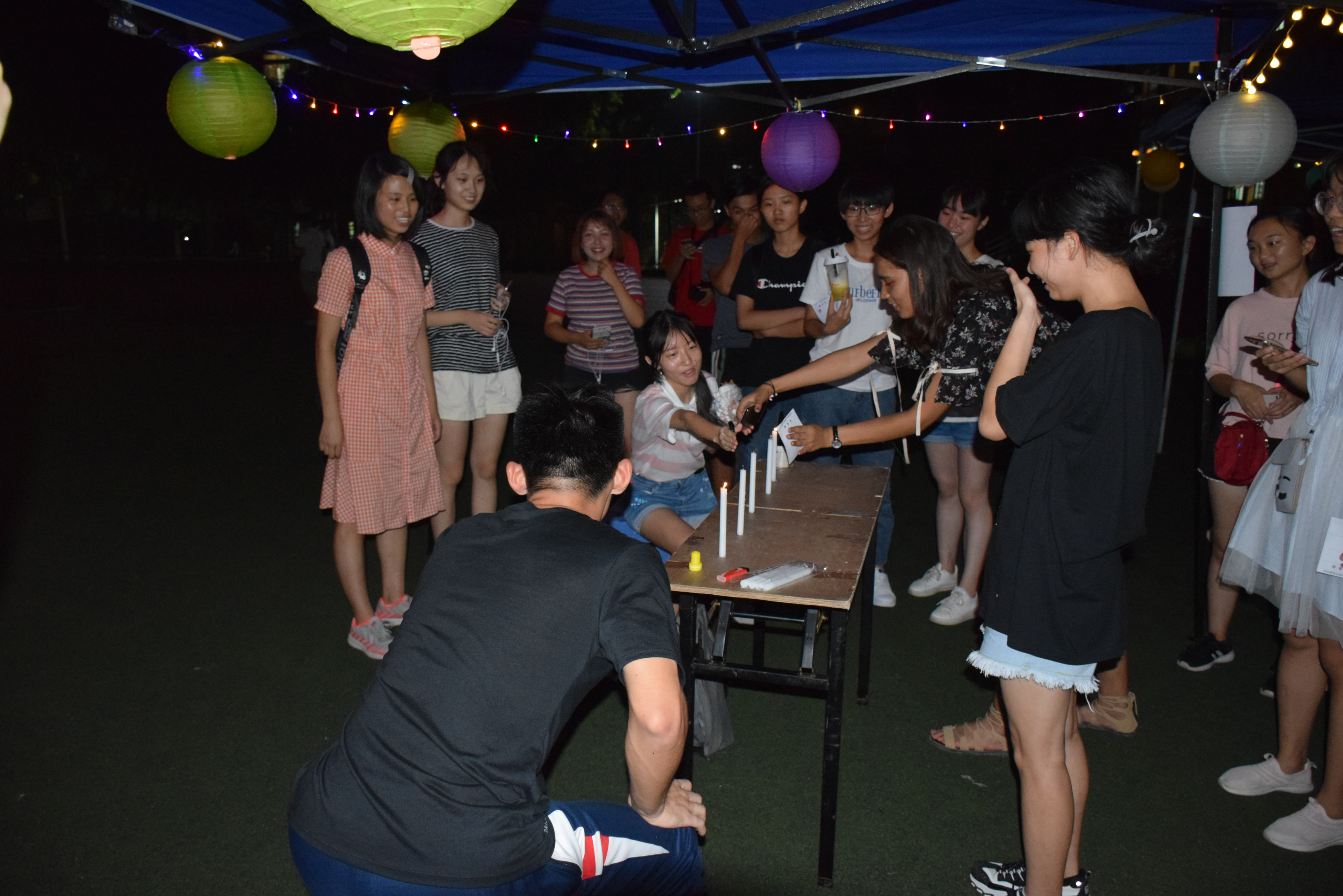 游园活动包含的7个有趣游戏,不但种类多样,取名也十分新奇。分别是“奔月”、“飞花令”、“投壶”、“正话反说”、“对王之王”、“一鸣惊人”以及“猜灯谜”。只见足球场上热闹非凡,有的同学表情严肃,寻找合适的角度把“软箭”投入壶中;有的两两合作,就着点点灯光大开脑洞疯狂猜迷;有的沉着冷静,在心里默默思索着七字绝句;有的脸含羞意却又倔强地吹着蜡烛……一片欢声笑语中,不知不觉就已过去两个小时。下午九点半,活动圆满结束,同学们带着各自的奖品散去。