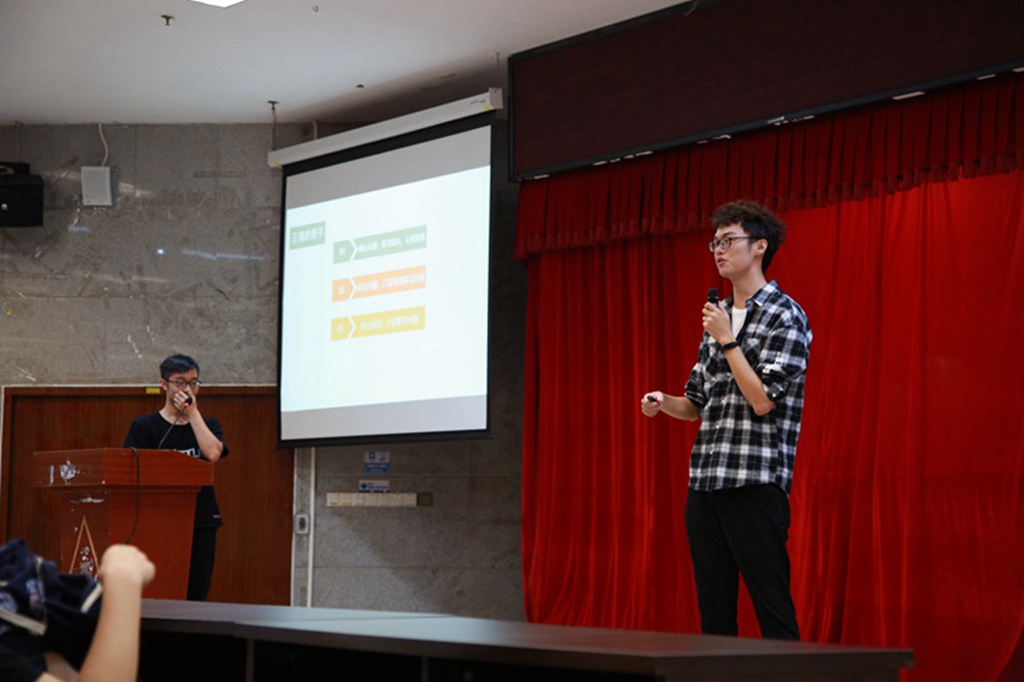 而后,便是本次宣讲会的主要环节——讲解辩论赛的相关事宜。随着主持人的介绍,强禹师兄上台以一社会热点问题“解决校园霸凌问题应从法律入手还是从教育入手”为例,生动形象地向18级新生介绍了什么叫做辩论,各辩手的分工,以及参加辩论赛的好处等。随后,他和现场观众进行了精彩互动并且和另一位嘉宾——黄博师兄进行简单的辩论示范,让同学们初次感受到了辩论的乐趣。
