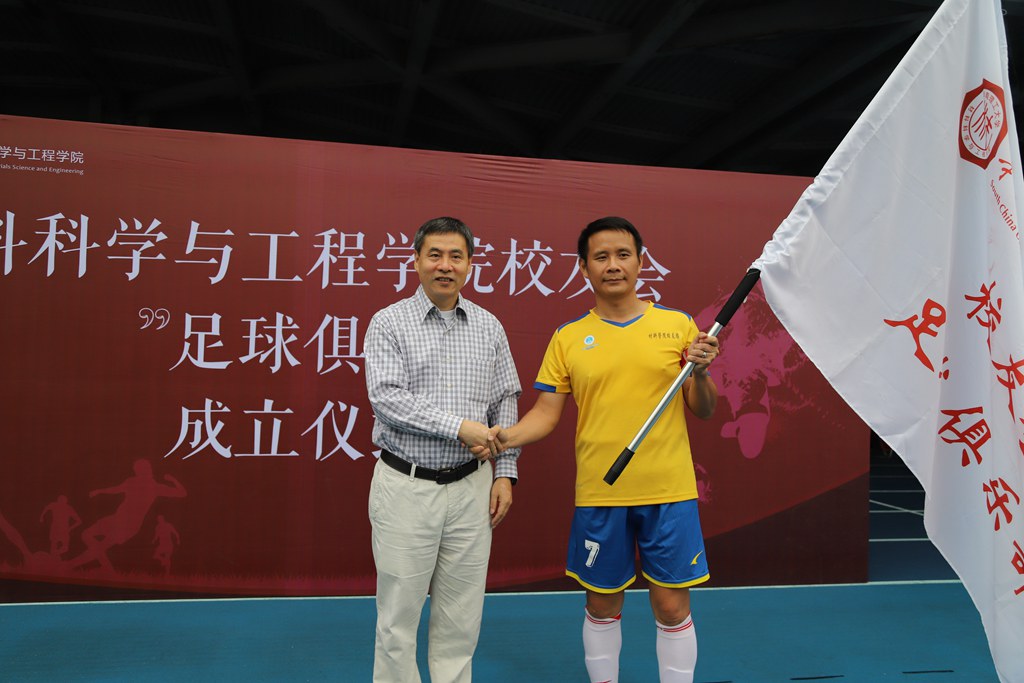 稍事休息后进行的是材料科学与工程学院校友会足球俱乐部成立仪式。材料学院校友理事会会长彭俊彪院长向校友会足球俱乐部授旗,校友会足球俱乐部吴昌荣会长致辞并宣布校友会足球俱乐部成立。彭俊彪院长、张勤远书记、郭建基校友、陈松辉校友、吴昌荣会长进行了开球仪式。