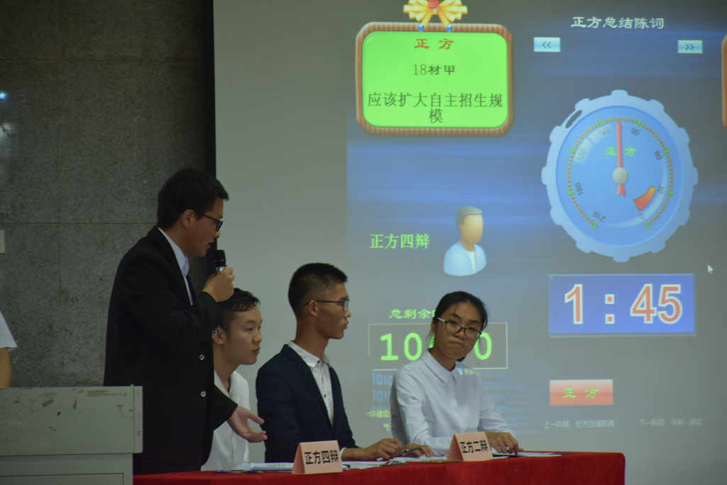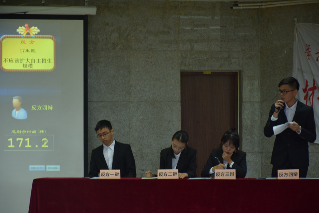 在主持人的宣布下,明辩杯决赛正式开始。进行辩论的两支队伍是18材甲与17生医,他们就“是否应该扩大自主招生的规模”展开了激烈的辩论。在简要的自我介绍后,双方一辩分别对自己所持观点进行立论。盘问环节中,双方就对方在立论环节的漏洞进行了激烈的盘问。你来我往的交锋,给在场的观众带来了一场精彩的表演。驳论环节中双方辩手更是各不相让。反方凭着丰富的经验不断抛出问题向正方求解,正方也以初生牛犊不怕虎的精神积极地寻找对方的漏洞进行反驳,台下的观众也不断为他们鼓掌。最后的总结陈词环节中,双方四辩对各自发言做出了精彩的总结。