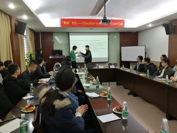 报告结束后,大家展开了热情的交流,一位博士后师兄谈到了自己在法国交流学习的经历,他说:“我在法国上课时,老师讲课仍然以法语为主题,这对于法语基础为零的我来说很吃力。那么俄罗斯大学是否也会存在这一情况?” Elena N.Govorun老师作了详细的解答,她说“本土语言教学当然存在,但是,对于留学生的课程,基本都是以英语教学为主,而且在校园中也可以用英语进行交流,所以学好英语对留学是很关键的。”之后,还有2名研究生提出了关于俄罗斯对研究生教育的要求以及研究生所要具备何种素质的问题,Elena N.Govorun老师也耐心地为大家解答。交流结束后,党委副书记彭树立老师向Elena N.Govorun副教授表示感谢,并赠予学院准备的纪念品,同时也表示了希望与俄罗斯更多的高校在科研和教育上达成更为深入的合作。