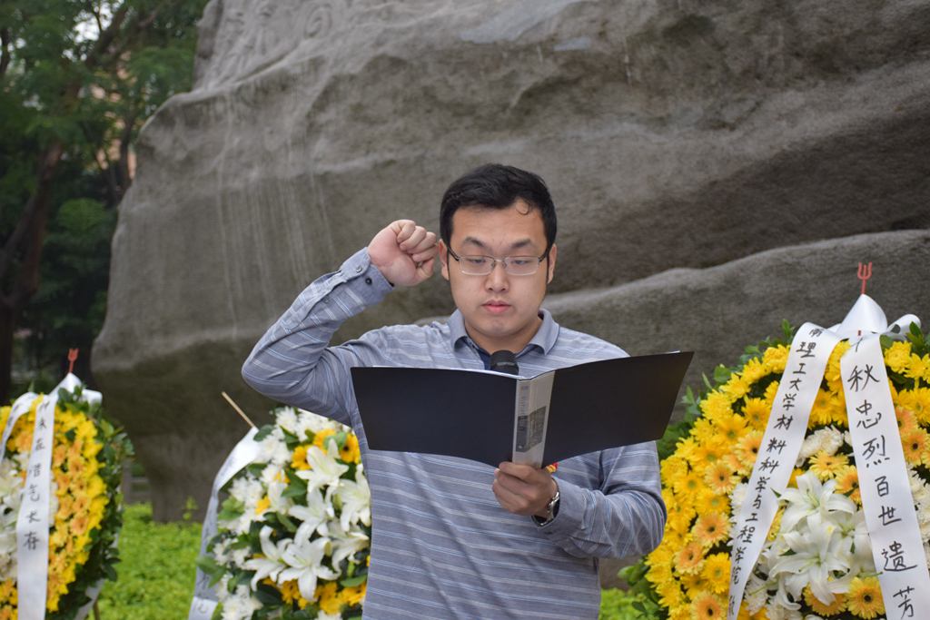 活动伊始,全体师生面对着巍然伫立的烈士纪念碑奏唱国歌。学生代表上前敬献花圈,以此表达对为祖国抛头颅、洒热血的英勇先辈们的崇高敬意。接着,同学们以严肃恭敬的态度听悼词,并默哀三分钟来寄托对先烈的无限哀思。学院原党委书记刘登坤老师结合他个人体会,激励同学们不忘初心,牢记使命,展现当代青年的担当,做中华民族伟大复兴的接班人!随后,在李俭老师的带领下,全体庄严重温入团誓词。