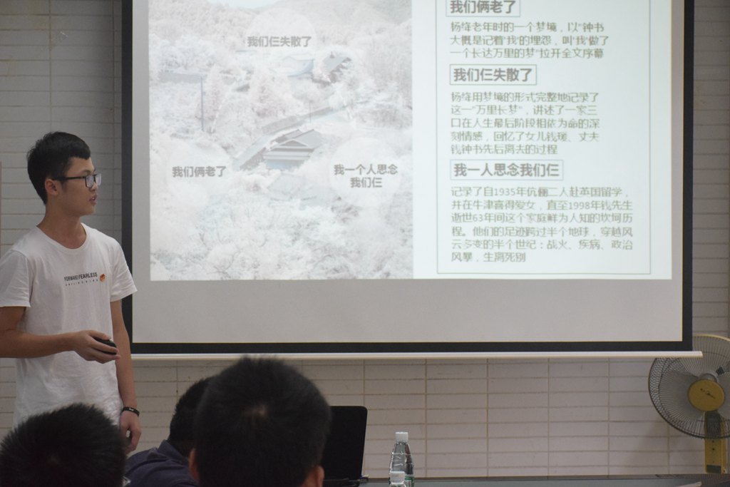 活动分为心得体会交流(各组代表做分享)、中场有奖问答、精读环节(名句赏析)、好书推荐、嘉宾分享等几个环节。活动开始,第一个分享自己阅读心得的是黄家明同学。他为在场的同学们介绍杨绛与钱钟书一家,展示了自己对《我们仨》的独特见解,赞扬了杨绛一家风雨共舟的精神。接着汪祥瑞同学介绍了科普读物《从一到无穷大》。他分享了阅读此书的思考感悟,认为万物之间都有密切的联系,无穷大数学、虚数与相对论、三维空间的弯曲等有千丝万缕的联系。新颖的观点赢得了同学们的阵阵掌声。随后的同学分享了对人类思维方式的深度思考、进行了对中国传统文化的探讨。最后一位分享的同学唐乔杨介绍了《了不起的昆虫》。会议室里笑声连连,气氛十分和谐。他还思考了人类在自然中的地位,揭示了昆虫与人的一些相似之处,逻辑严密。紧接着的名句赏析环节,同学们深情朗读、抒发己见;好书推荐环节同学们亦慷慨分享,向在场的嘉宾和其他同学推荐了自己珍爱的书籍。