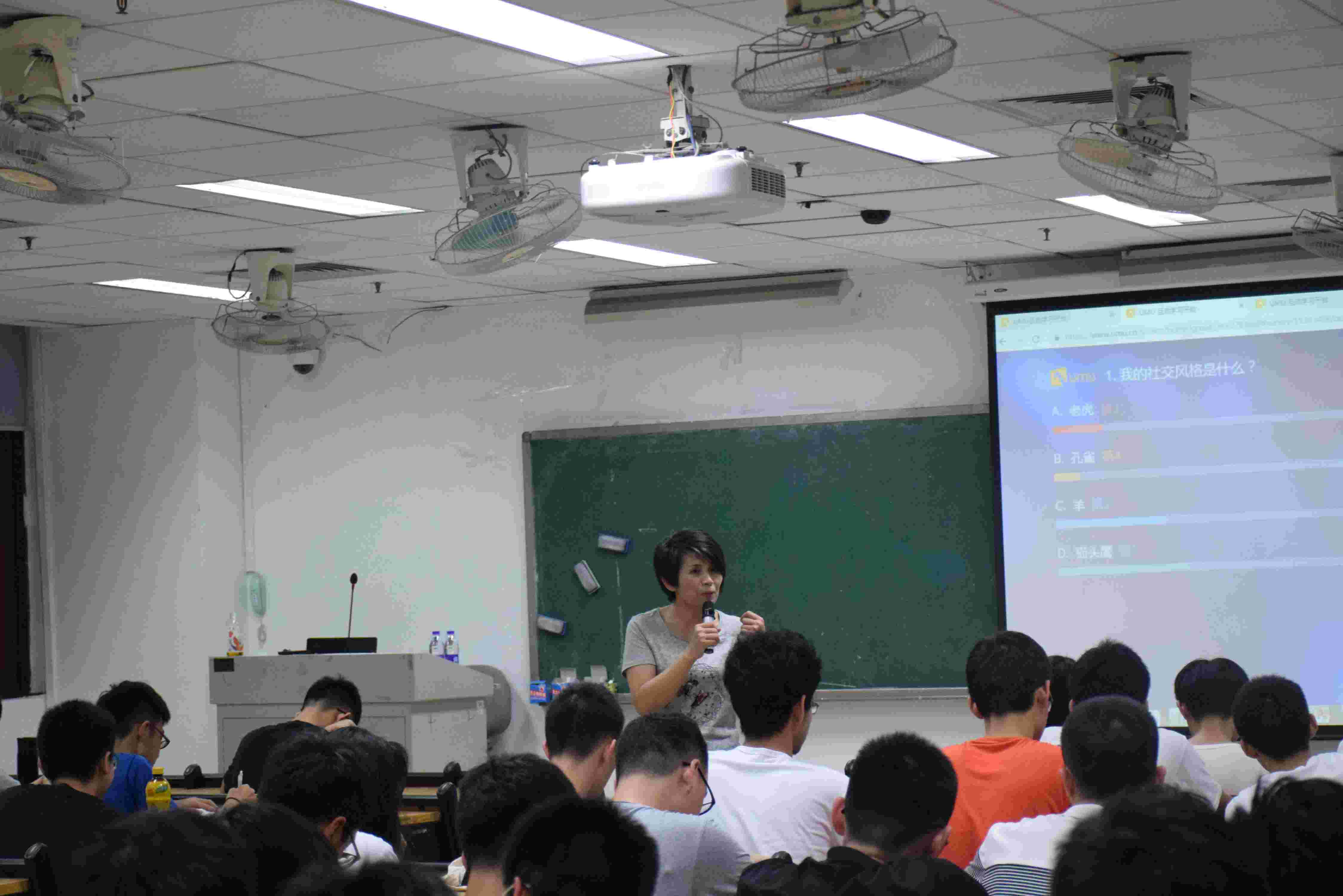 讲座上,薛芬妮老师通过填写调查问卷的方式让同学们了解自身的社交风格,并结合她本人的切身经历,述之以情,晓之以理。薛芬妮老师不仅充分地调动同学们参与到讲座中,同时也让同学们认识到学习、善用社交风格的重要性。讲座过程中,薛芬妮老师以四种动物代替四种类型的风格,通过视频、小组讨论、现场演绎的形式让同学们意识到不同风格的人的特点和学会如何与不同风格的人交往。薛芬妮老师特有的活力与热情活跃了现场气氛,在座同学们热烈回应,师生互动也有来有往。讲座结束后,同学们热烈地感谢薛芬妮老师的激情演讲并有序离场。