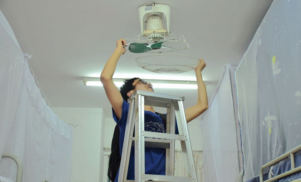 一间稍稍有点昏暗的宿舍里,地上五张椅子垒在一块,一名男生站在椅子上,一手撑住天花板,一手拆卸着电扇组件,虽然搭建起来的椅子有点晃动,却丝毫没有中断他全神贯注拆卸电扇的状态。而在他所站立椅子的旁边,另一名男生正用力地扶住椅子,一名女生也踮起双脚用手电筒为拆风扇的男生照明。阳台上传来阵阵水声,还有一位志愿者在用毛巾清洗着拆卸下来的电扇防护罩。