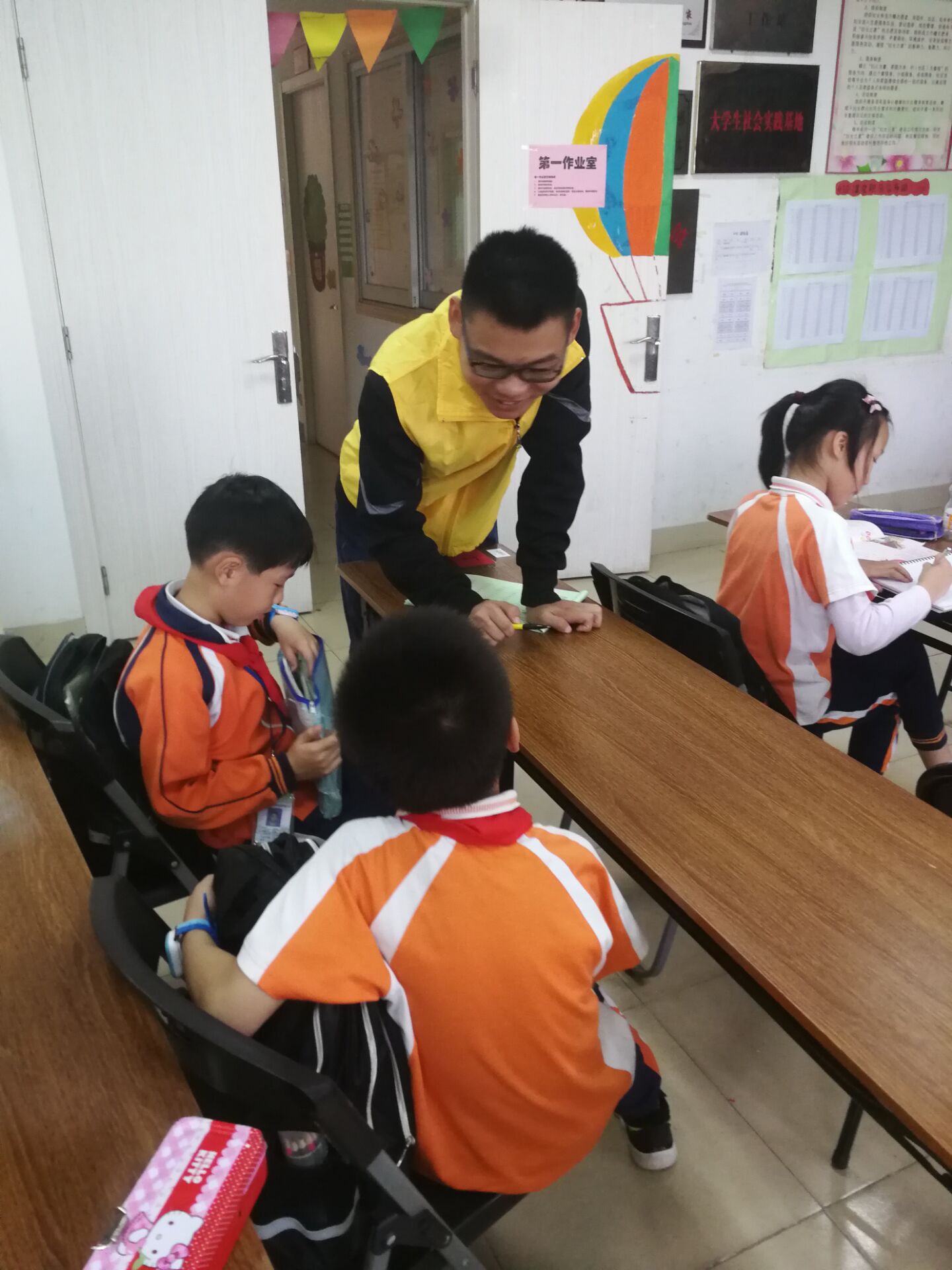 约5点,同学们抵达了志愿点,因为新的一年规矩有变动,并未立刻开始工作,而是听工作人员讲解志愿服务流程。利用介绍的时间志愿者一行进行了签到和任务分配。汪俊锐、焦飞宇、左文财、李婉婉、周吕、李非凡6位同学划分了各自的工作范围。小朋友陆续到达辅导中心后,同学们很快投入了各自的工作,开始为自己负责的小朋友们提供细致入微的指导。在各自的工作范围内,志愿者们认真辅导作业,严格记录加分扣分项,对小朋友们很是细心,无论是比较顽皮的小朋友,还是比较安静听话的小朋友,都在志愿者们的管理下认真学习。小朋友们认真学习的神情与志愿者们忙碌的身影相互映衬,使整个教室充满了关爱与温暖的气息 。
