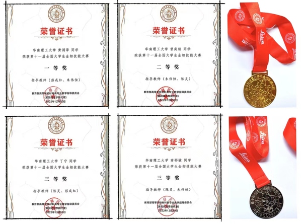经过将近两个月的赛程,最终300名选手获得了一等奖,525名选手获得了二等奖,658名选手获得了三等奖。在全国决赛中,华南理工大学黄润泽同学获得一等奖,曾奕铭同学获得二等奖,丁宁和南邵骏同学获得三等奖,彭成红和朱伟恒获得优秀指导教师奖。在广东省大学生金相大赛中,华南理工大学获团体三等奖。