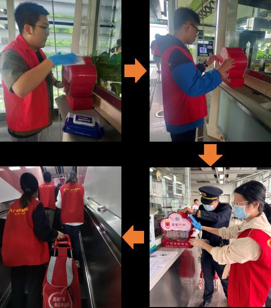 在志愿服务活动期间,同学们积极主动配合广州市慈善会工作人员的任务安排和广州地铁工作人员的要求,有条理、有耐心地完成自己所负责的任务。活动的主要内容有:撕下募捐箱上的旧贴纸,并用酒精湿巾擦拭箱体,等箱体干燥后再贴上新的贴纸,确认无误后开箱收集善款装于红布袋中。大家在完成一个站点的志愿工作后,立即奔赴下一个站点。
