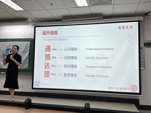 “通情达理”中的“达”指的是转化情绪。刘老师向同学们展示转化情绪的各种各样的方法,也请同学们分享自己调节情绪的方法。对于“通情达理”中的最后一步“理”,管理情绪,刘老师通过一段视频来说明情绪管理的重要性。最后,刘老师介绍与他人交往时的方法——情感账户,来更好地与他人相处。