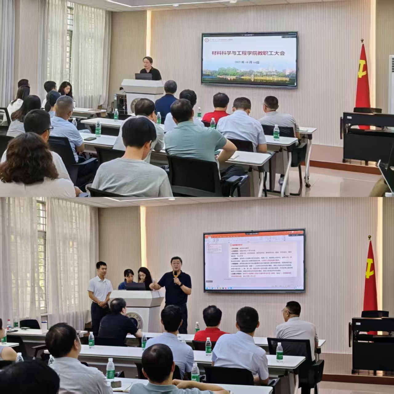 2025年10月16日14:30,华南理工大学材料科学与工程学院在14号楼205会议室召开本科教育教学审核评估迎评工作推进会。学院党政负责同志、各党支部书记、系主任到场参会,全院教职工通过线上方式同步参加。会议旨在深入贯彻落实学校迎评工作精神,全面推进学院迎评工作,凝聚全院力量,确保审核评估工作高效推进。