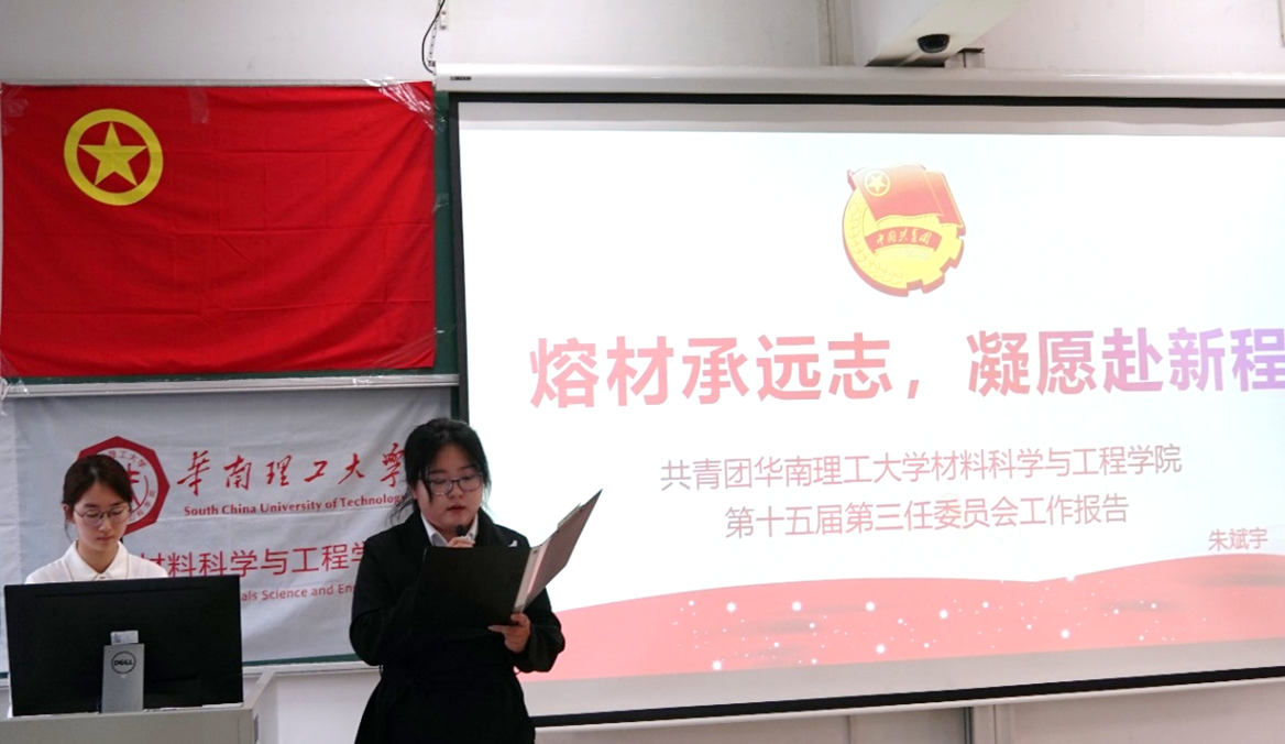 共青团华南理工大学材料科学与工程学院第十五届委员会第四次全体(扩大)会议,在庄严肃穆的国歌声中正式拉开帷幕。首先,朱斌宇同学代表共青团华南理工大学材料科学与工程学院第十五届第三任委员会作工作报告。这份报告以详实的内容和精准的数据,全面盘点了学院团委年度工作,在思政教育、实践育人、科创竞赛、文化涵养与学风建设等方面成效显著。报告最后进一步规划了学院团委未来工作,清晰指明了发展新目标、行动新作为与事业新期待。