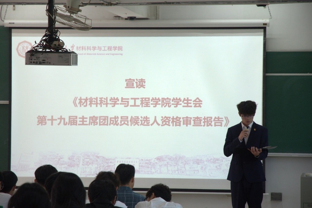 学院学生会主席团成员黄凯文同学宣读《华南理工大学材料科学与工程学院学生会第十九届主席团成员选举办法》、《监票人、计票人资格审查报告》、《主席团成员候选人资格审查报告》等内容,全体参会成员听取并审议通过。