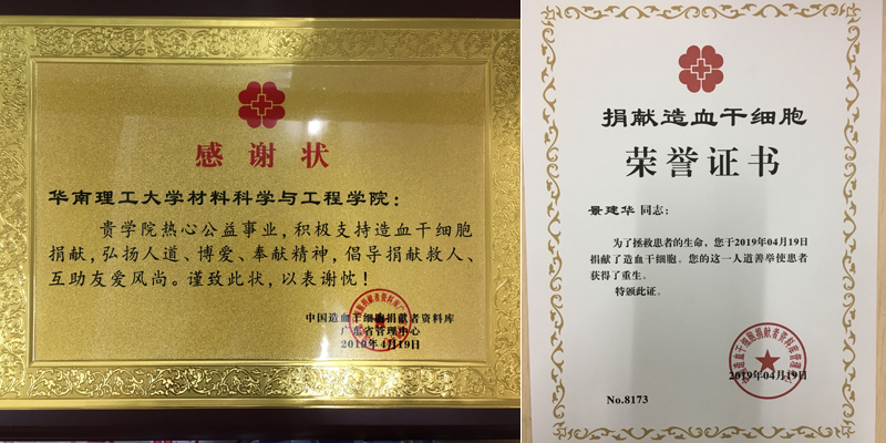 近日,材料学院收到一份来自中国造血干细胞捐献者资料库颁发的感谢状:中国造血干细胞捐献者资料库为材料学院2018级研究生景建华的无私捐赠行为特意发来感谢状和荣誉证书,特别诚挚地感谢了景建华同学捐献造血干细胞,以生命点亮生命的爱心善举。