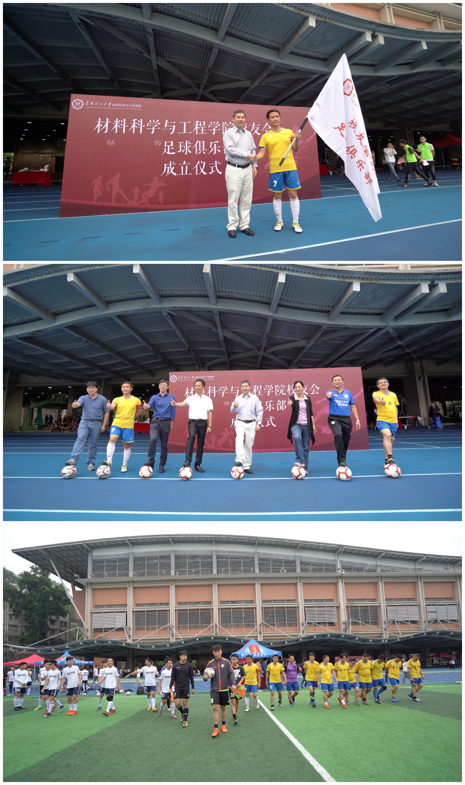 在西区体育足球场,学院隆重举行了“三雄极光奖教奖学金”捐赠仪式暨校友会足球俱乐部成立仪式。三雄极光股份有限公司已在学院设立奖教奖学金多年,充分体现了他们对教育事业的一片热心。在校友会足球俱乐部成立之后,学院领导和校友代表宣布开球,校友和学生进行了两场联谊赛,分别是材料学院校友队对阵本科及研究生联队,顺德力途球会校友队对阵华南理工大学乙组球队,在足球场上,各队球员挥洒汗水拼尽全力,赛出了材院足球健儿的风采。