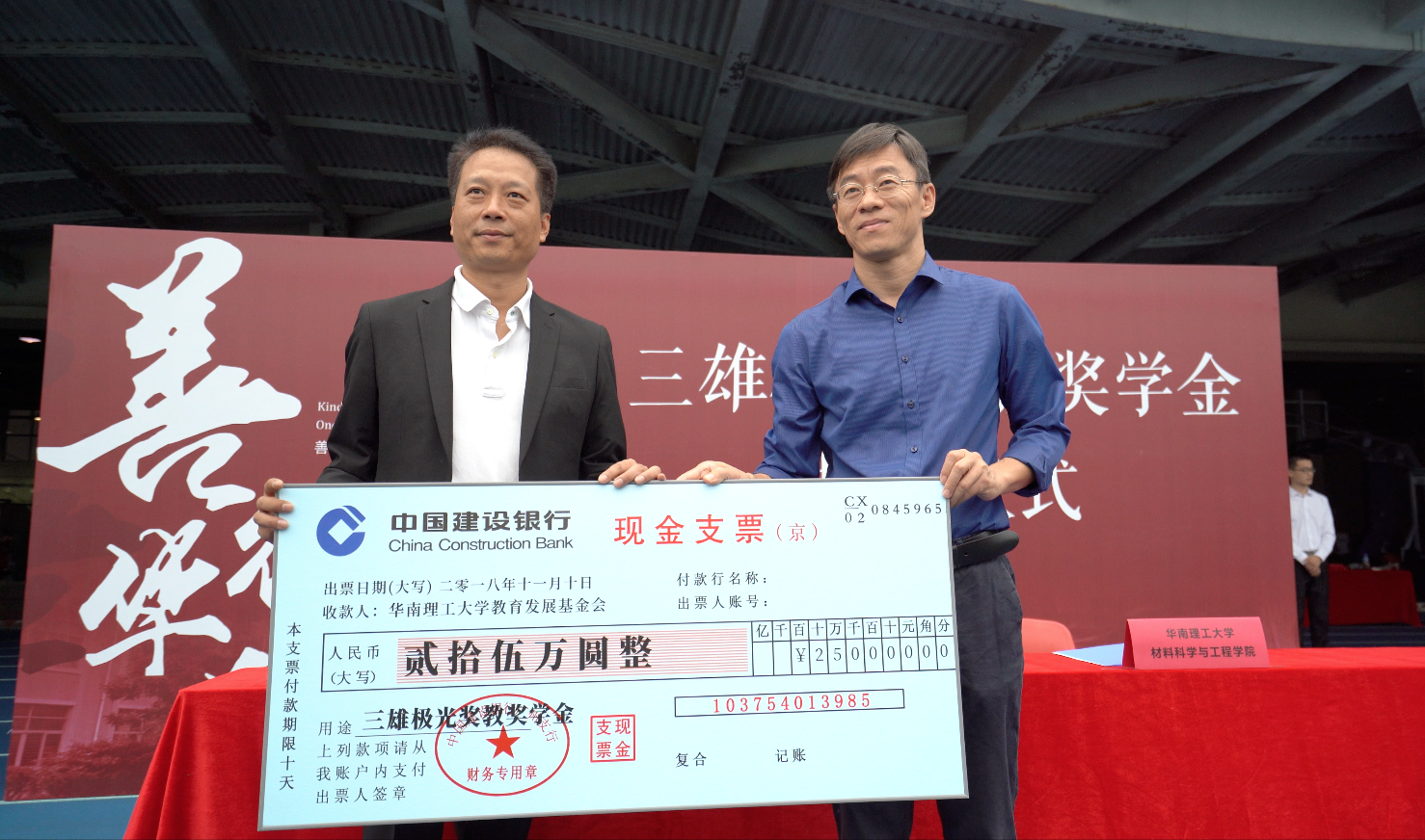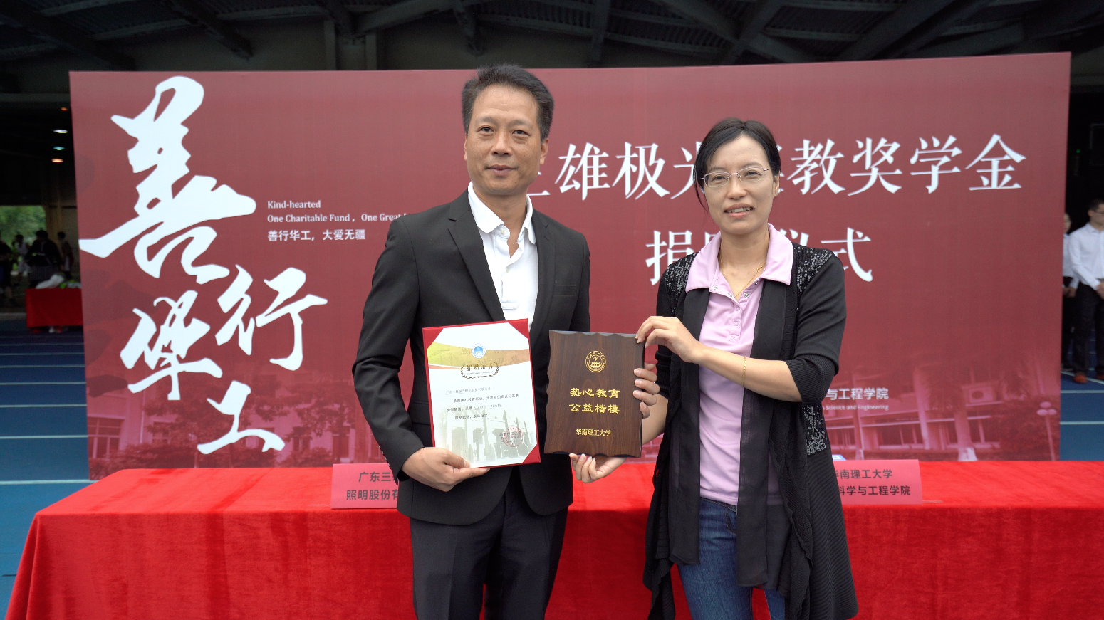 捐赠仪式上,在校友和学生们的见证下,双方代表三雄极光照明股份有限公司副总裁陈松辉校友和材料学院彭俊彪院长签订捐赠协议书。随后,陈松辉校友向张勤远捐赠25万元支票,吴妙娴代表学院向三雄极光照明股份有限公司颁发了捐赠证书和捐赠纪念牌匾。陈松辉校友在致辞中表示三雄极光已在学院设立奖教奖学金多年,也得到了学院的大力支持,今年继续设立三雄极光奖教奖学金,希望以此促进学院建设与发展,激励在校学生勤奋学习,培养更多的优秀人才。最后陈松辉校友为获得奖教奖学金的老师和同学颁发了三雄极光奖教奖学金。
