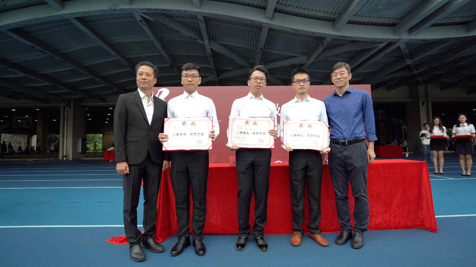 2018年11月10日是华南理工大学第六个校友返校日,又恰逢学校组建66周年之际。这天上午,学院在西区运动场举行“三雄极光奖教奖学金”捐赠仪式暨校友会足球俱乐部成立仪式。广东三雄极光照明股份有限公司副总裁陈松辉校友,足球俱乐部会长吴昌荣校友,以及学院院长彭俊彪,党委书记张勤远,党委常务副书记吴妙娴出席活动。