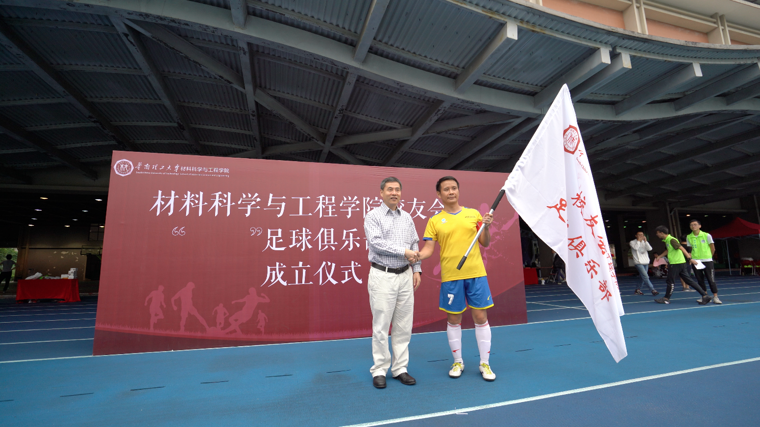 在足球俱乐部成立仪式上,彭俊彪院长向吴昌荣校友颁授会旗。吴昌荣校友代表足球俱乐部发言,他向参与俱乐部筹建的校友们表示感谢并表达了对学院的感恩之情。他表示将不负所托,积极开展俱乐部的各项工作,使俱乐部成为材院校友沟通交流的纽带。广州校友会理事长李冠强校友向足球俱乐部捐赠纪念品以表祝贺。最后,材料学院足球嘉年华在学院领导和校友代表开球仪式之后拉开帷幕,上午是校友队VS本科及研究生联队,下午是顺德力途球会校友队VS华南理工大学乙组球队,现场还设置了丰富的嘉年华小游戏,让校友们与在校学生同乐其中。