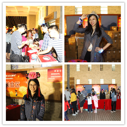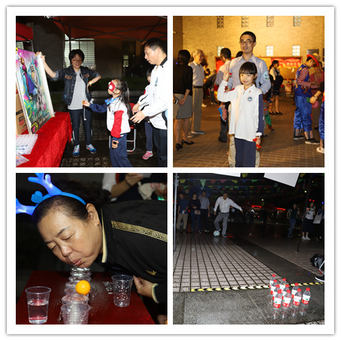 接下来是趣味十足的游园项目。麟鸿楼广场一顶顶红帐篷下面,侯着一排排摩拳擦掌、跃跃欲试的教职工、家属和小朋友们。看,这边是“步步为营”场地,一位老师瞪大眼睛、鼓足腮帮,盯着水杯上的乒乓球小心翼翼地吹;这边是“健身保龄”项目,小朋友抡圆了脚,将足球踢向对面的“矿泉水保龄球”,力争一击命中“STRIKE”;那边是“贴鼻子”,一位小女孩戴上眼罩去摸索前面图画中的鸭鼻子,滑稽的样子引起其他人的大笑;那边是“我心飞翔”,路过的老师忍不住参与其中,叠起了纸飞机,重温了一把童年的乐趣,至于谁飞的更远,也不那么重要了……整个游园现场设置了14个趣味小游戏,每个游戏摊位人头攒动,欢声笑语,麟鸿楼变成了“材院游乐场”。