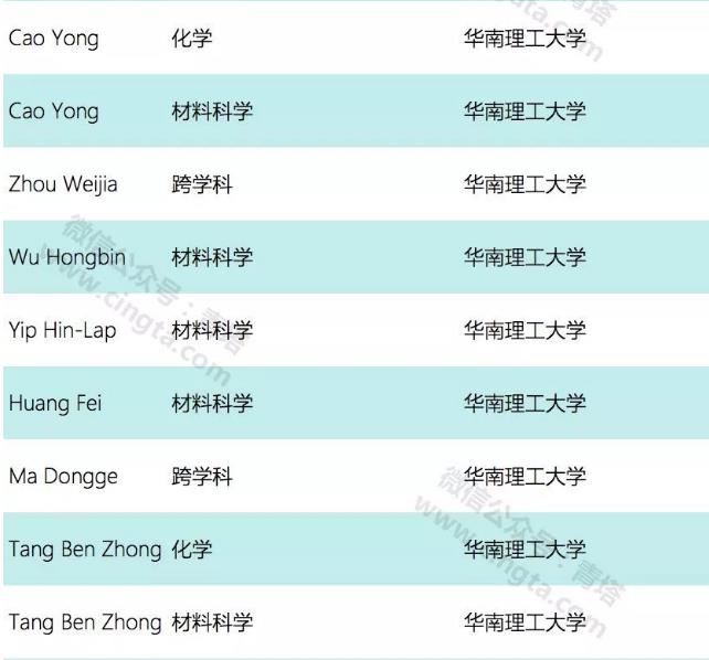 华南理工大学获得科睿唯安2018年全球“高被引科学家”的名单