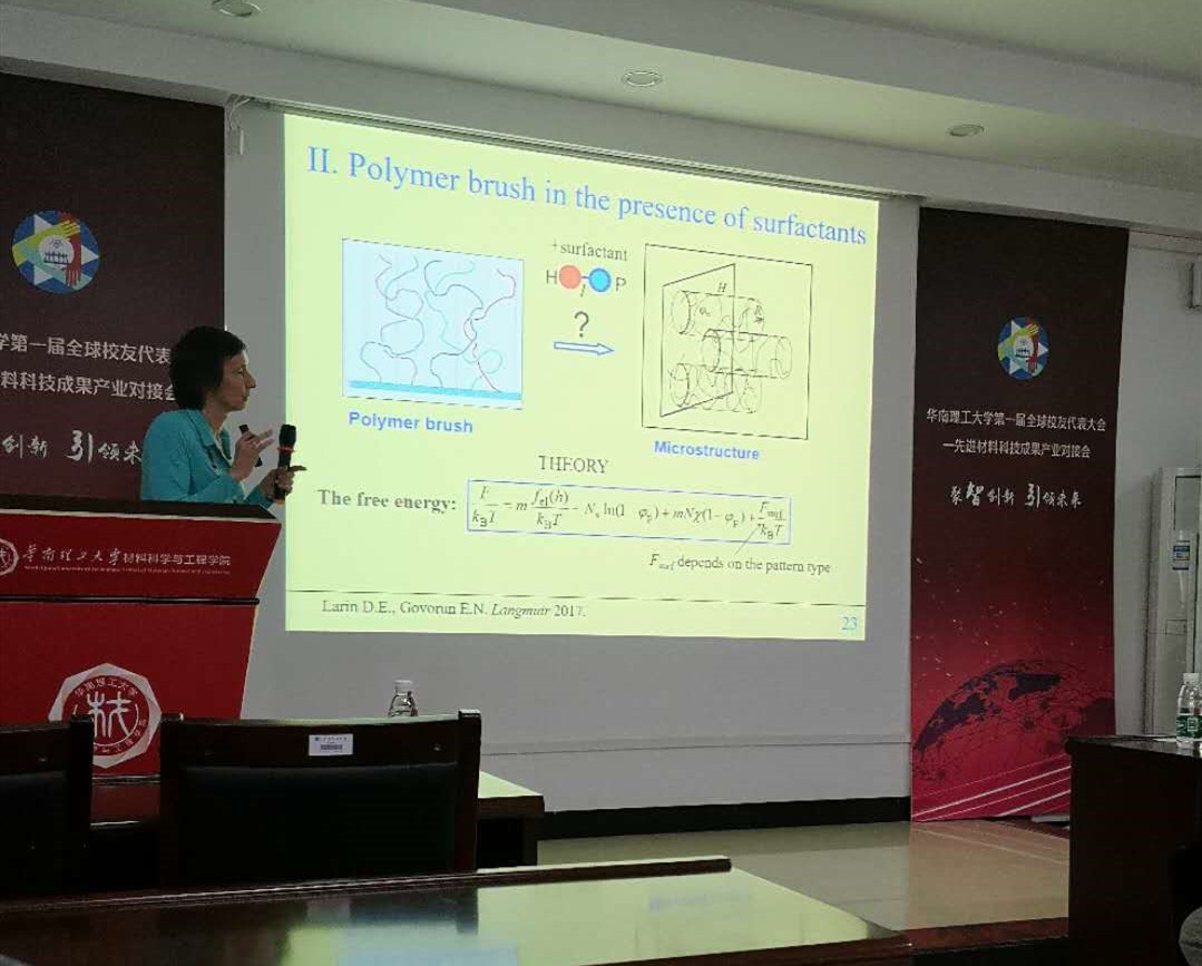 1月10日,Elena Govorun副教授在唯美楼作题为“Self-Assembly in Amphiphilic Polymer and Polymer Surfactant Systems”的学术报告,张广照教授主持报告。她介绍了双亲性高分子的自组装行为并阐明原理,她还借助双亲性形态相图对疏水性分子与极性分子自组装成大分子的动力学进行了阐述。随后,她又作了题为“Methods and Applications of Statistical Physics of Macromolecules”的学术报告,介绍了大分子统计物理学的方法和应用。她结合具体实例,从统计物理学的角度入手,对小分子反应生成大分子过程当中的压强、温度、内能等宏观量的微观本质进行了详细的解释。