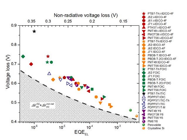 研究者首先系统研究了有代表性的高性能给体/受体材料体系,其电压损失尤其是由于存在非辐射跃迁复合造成的电压损失,对器件的辐射效率的依赖关系。研究发现,随着给体/受体能级差的减小,器件的辐射效率显著提高,且上述电压损失与器件的辐射效率的对数呈显著负相关。这一发现,为以辐射效率作为评判给体/受体之间的能级差大小提供了实验依据。进一步地,利用这个测量方法,结合器件性能和内量子效率的测量结果,统计得到相对最优的给受体能级差---并以辐射效率测量值的方式直观呈现。在此能级差附近,有机太阳电池以最小的能量损失代价实现高效的光电转换,从而获得最高的能量转化效率。结合上述实验结果,基于Shockley−Queisser框架的单结有机太阳的理论极限效率被确定在29-31%之间。