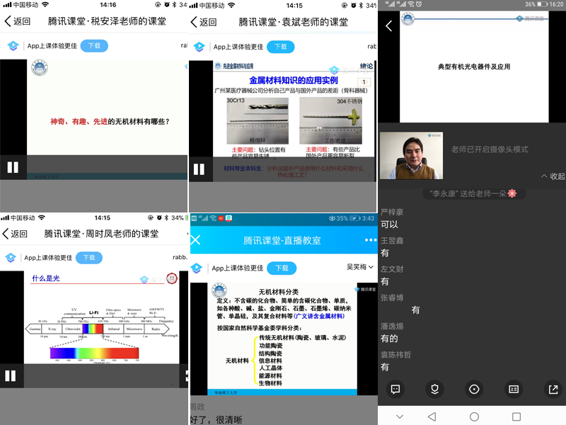 2月24日开学以来,华南理工大学材料学院新学期课程如期线上开课。学院授课老师们采用中国大学MOOC、雨课堂、腾讯课堂、QQ群+语音等教学平台开展线上教学,同学们线上踊跃发言,互动交流,线上教学井然有序,取得良好的教学效果。