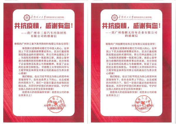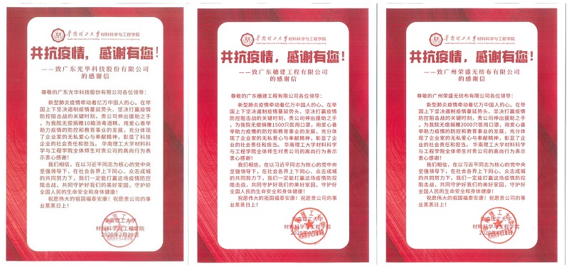 在高分子系严玉蓉教授的联系协调下,广州荣盛无纺布有限公司为我院捐赠医用口罩2000只;此外,严玉蓉教授无偿提供了一批熔喷布,并联系了广州市三泰汽车内饰材料有限公司与广州俊麒无纺布企业有限公司代加工,解决了口罩不足的燃眉之急;