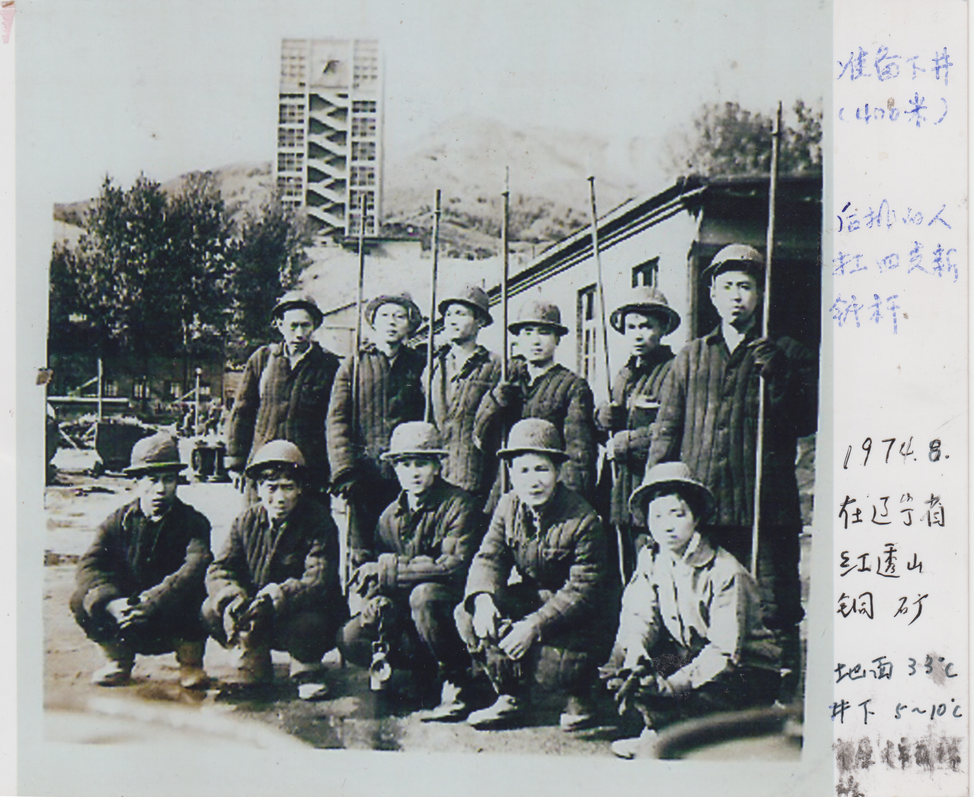 1974年 林鼎文+刘正义教授带学生进行钎杆试验-红透山铜矿坑口合影(辽宁省抚顺市青原县,地面气温33,井下5度)