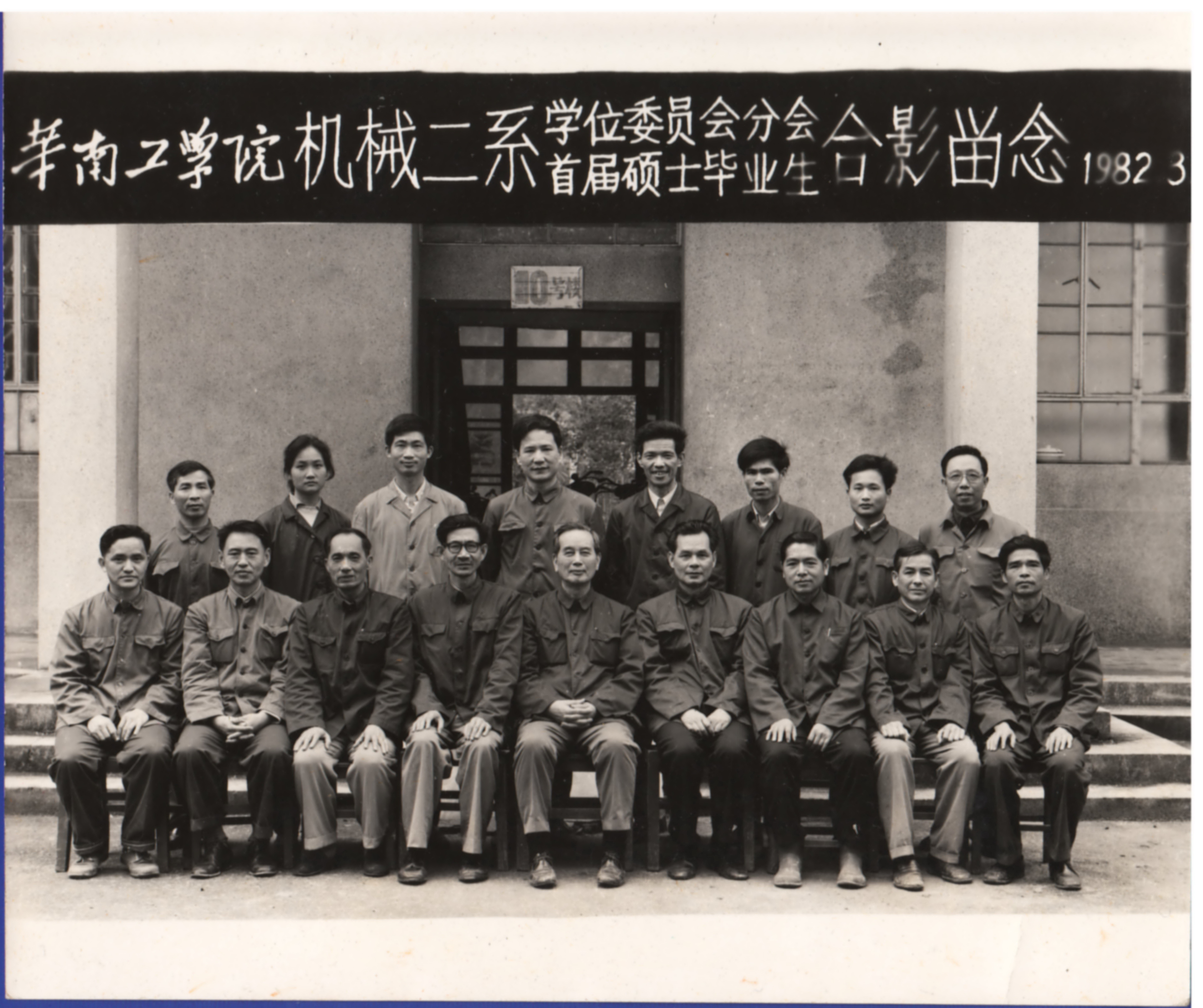 改革开放后华南理工大学金属材料及热处理专业首届硕士研究生毕业留影-1982.前排左起,彭列明,孙育智,梅福欣,周绍华,余仲奎,黄家骧,黄寿洪,宗权英,林法禹,后排左起,李祖鑫,杜晓乔(学生),张育仁(学生),刘正义,陈康年,陈仲毅(学生),刘伟和(学生),李扬宗
