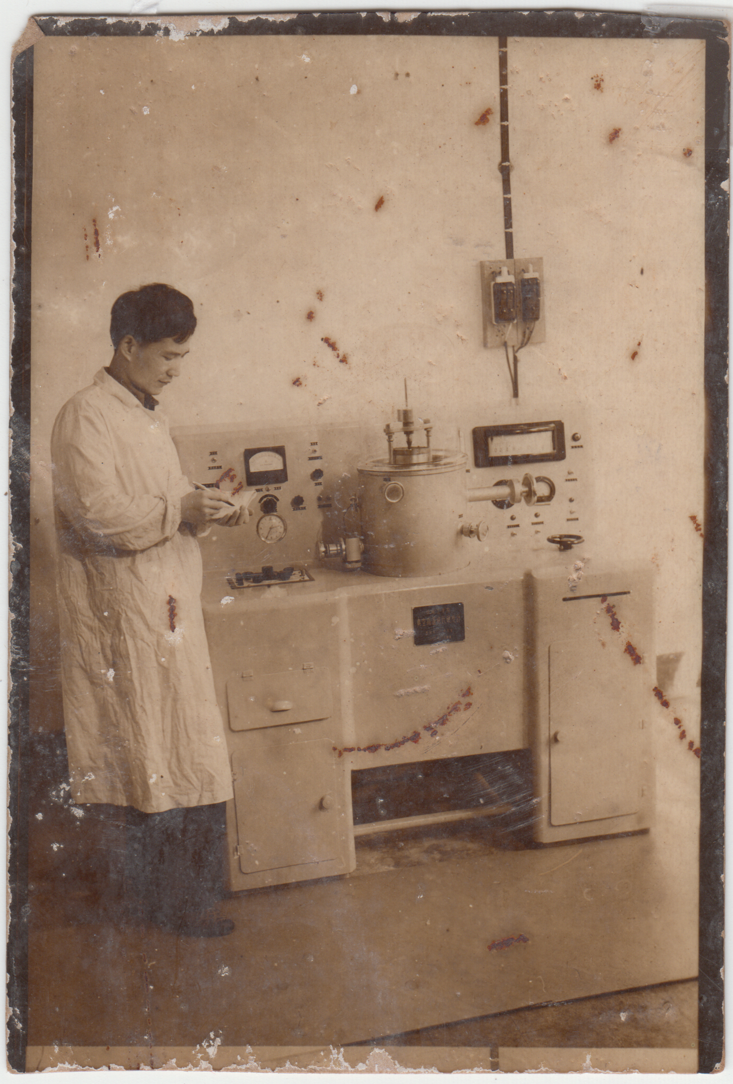 刘正义老师在测量MoSi2(1150℃下)的硬度自制真空高温(1350℃)威氏硬度计)-1965年